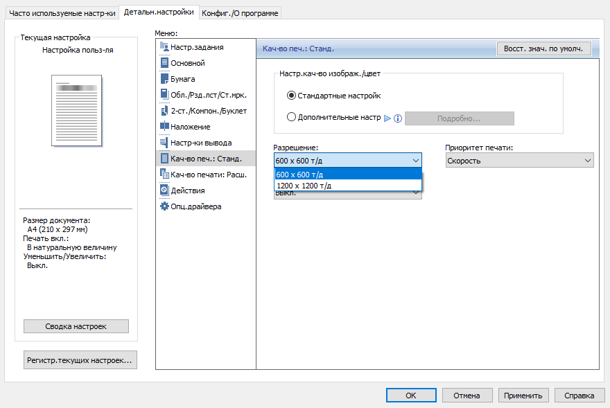 | Разрешение | Приоритет | Время, с | Скорость, стр/мин |
