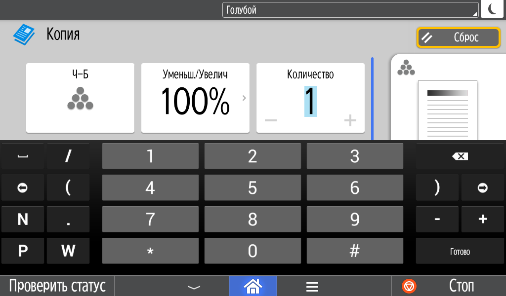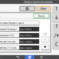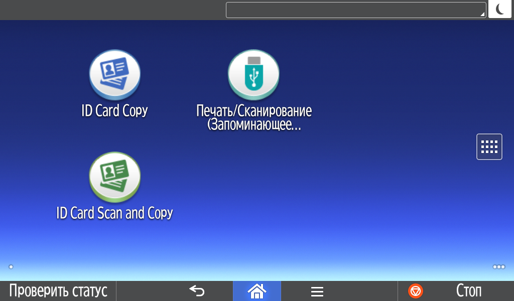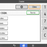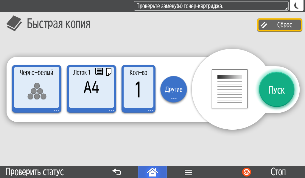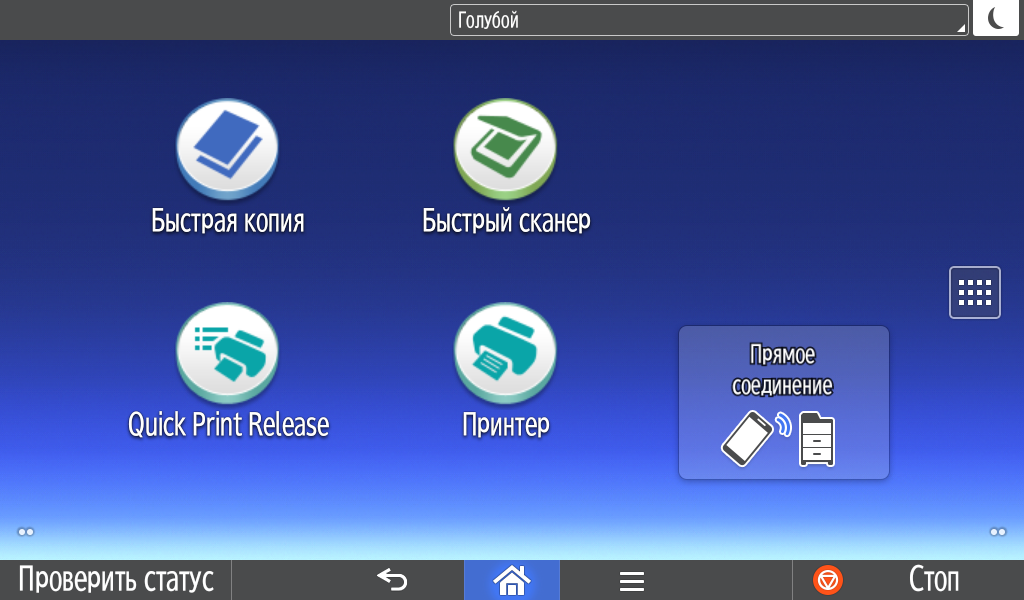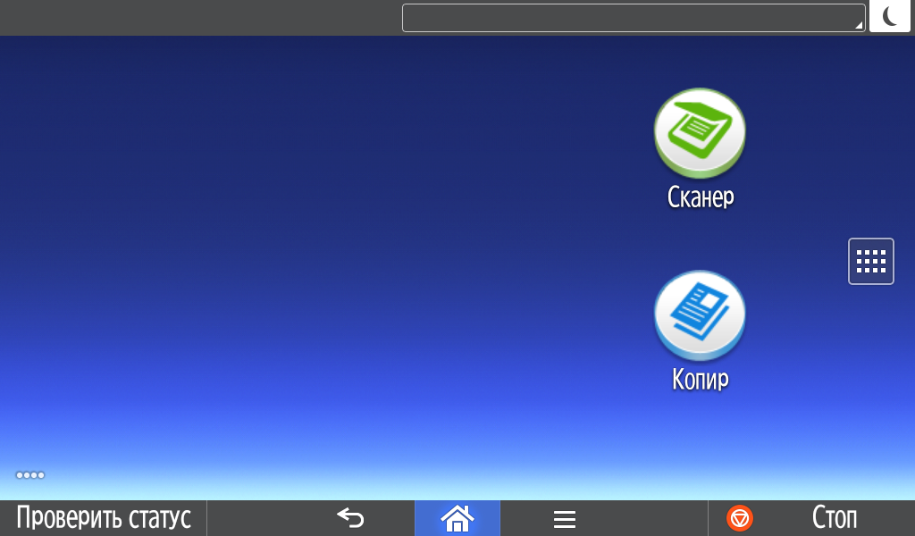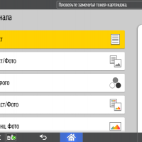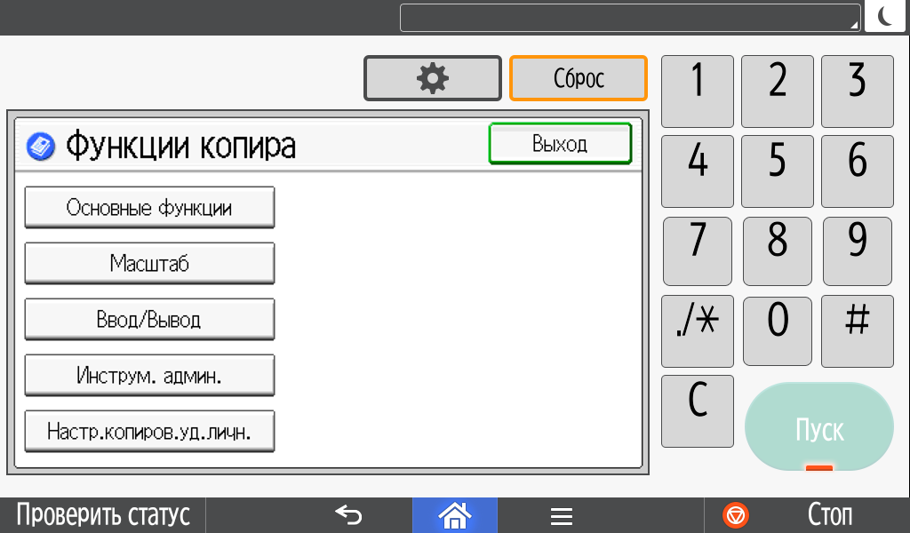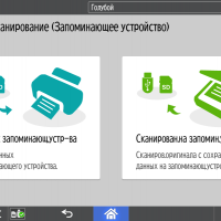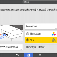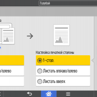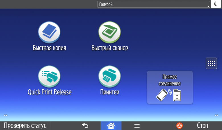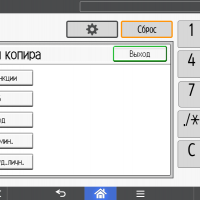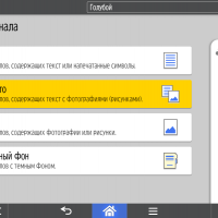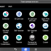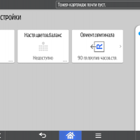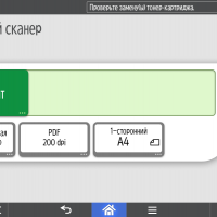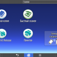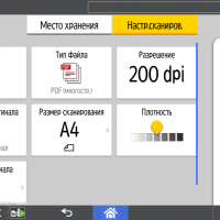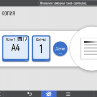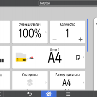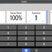 Для каждой из основных функций имеется соответствующий инструментарий: выбор параметров в виде крупных прямоугольных иконок, а также тот или иной набор управляющих кнопок. Кроме этого, в графическом виде отображаются и некоторые установки (например, цветной или монохромный режим копирования).