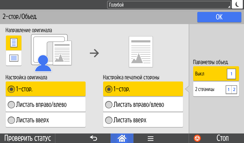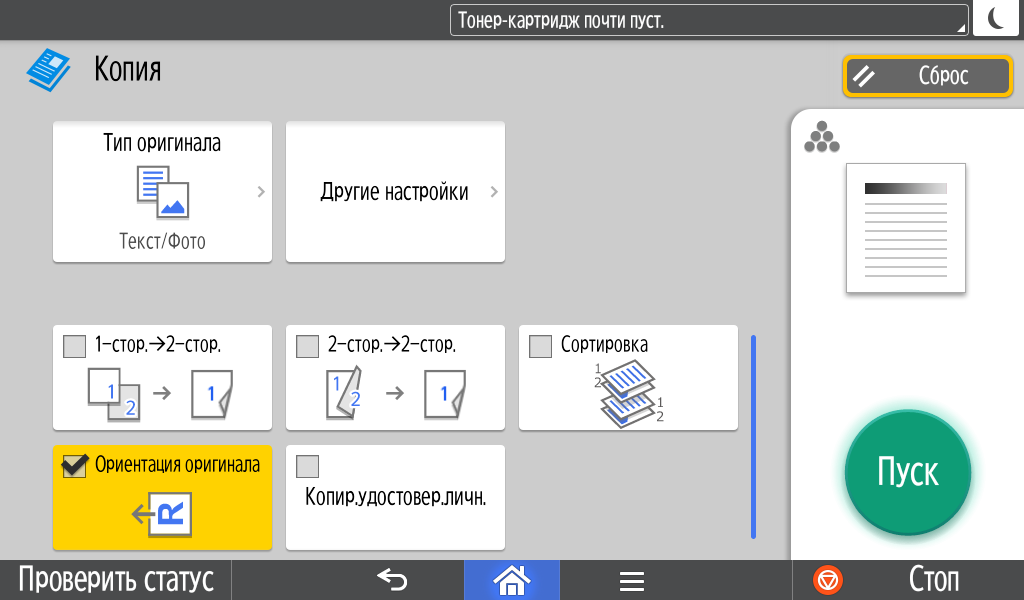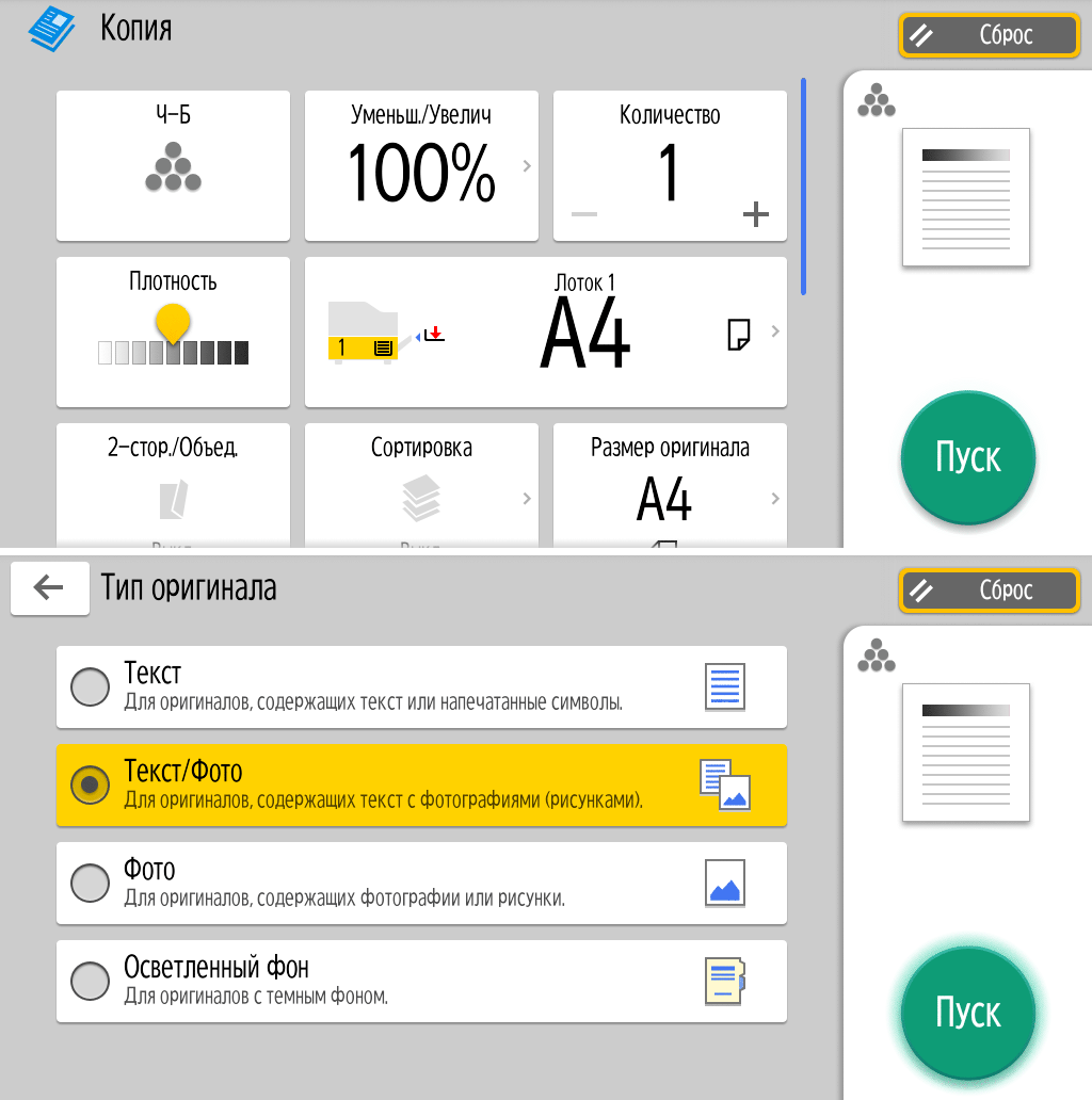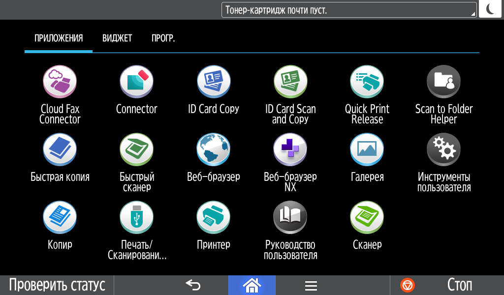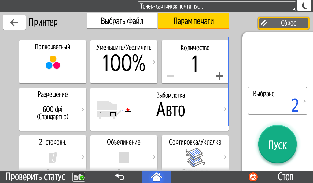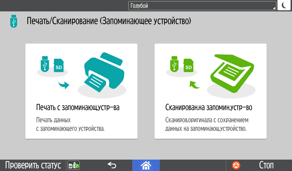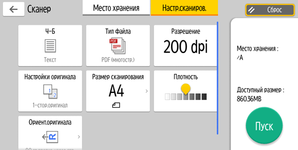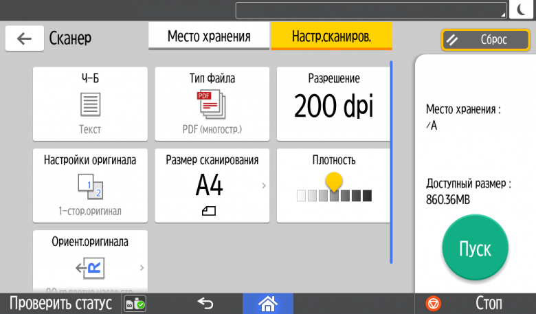 Для каждой из основных функций имеется соответствующий инструментарий: выбор параметров в виде крупных прямоугольных иконок, а также тот или иной набор управляющих кнопок. Кроме этого, в графическом виде отображаются и некоторые установки (например, цветной или монохромный режим копирования).
