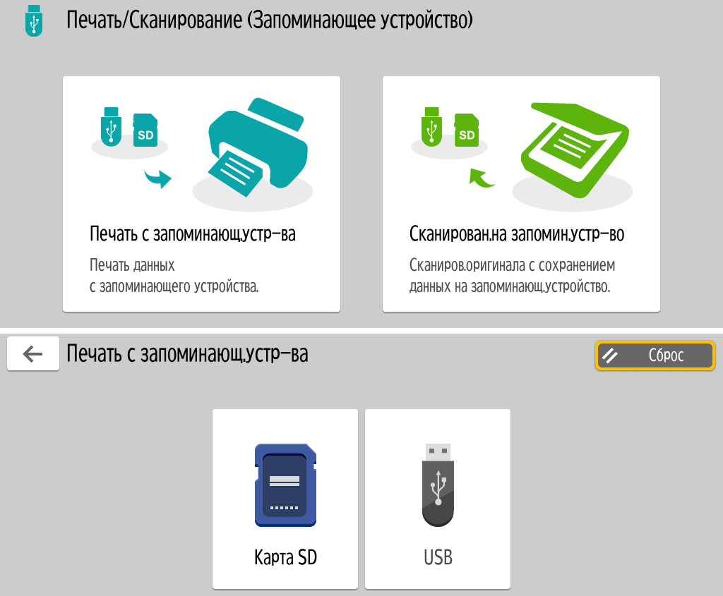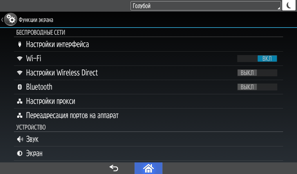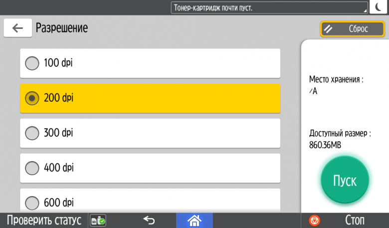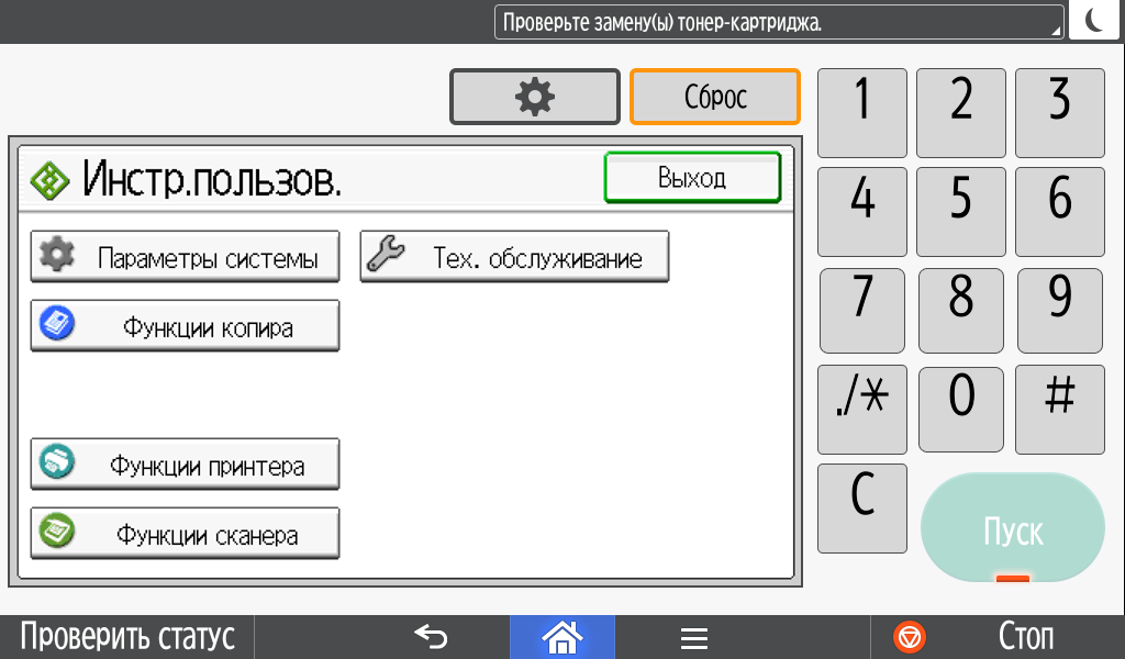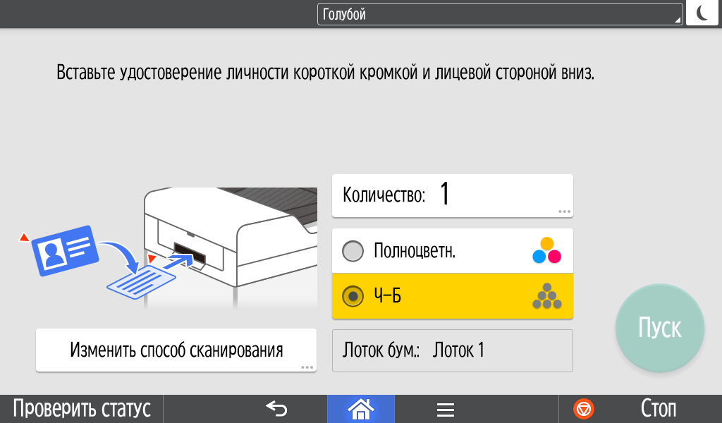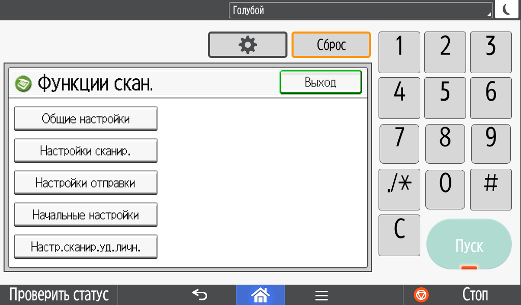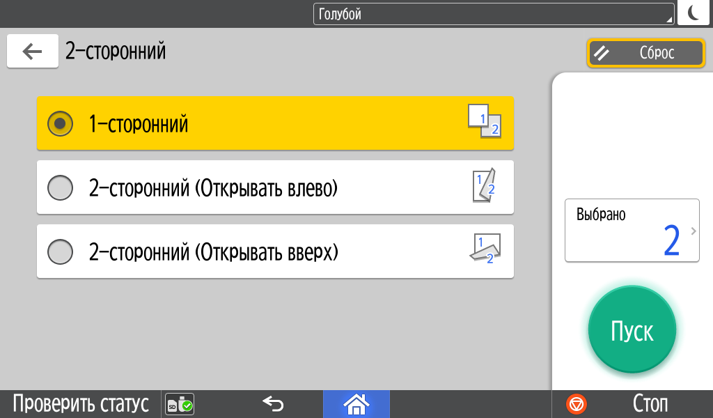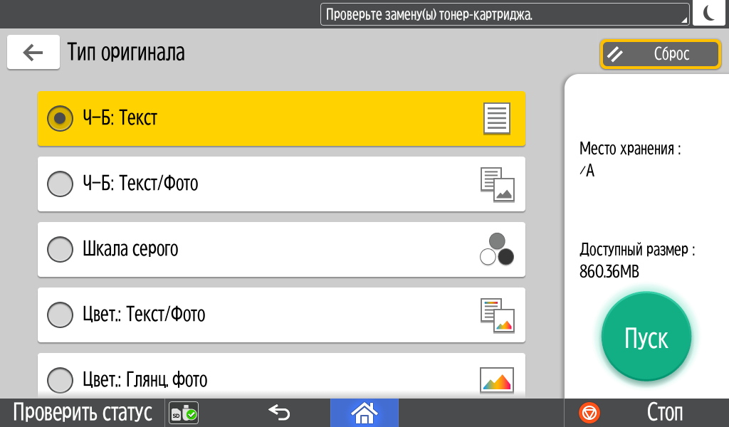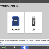 Для каждой из основных функций имеется соответствующий инструментарий: выбор параметров в виде крупных прямоугольных иконок, а также тот или иной набор управляющих кнопок. Кроме этого, в графическом виде отображаются и некоторые установки (например, цветной или монохромный режим копирования).