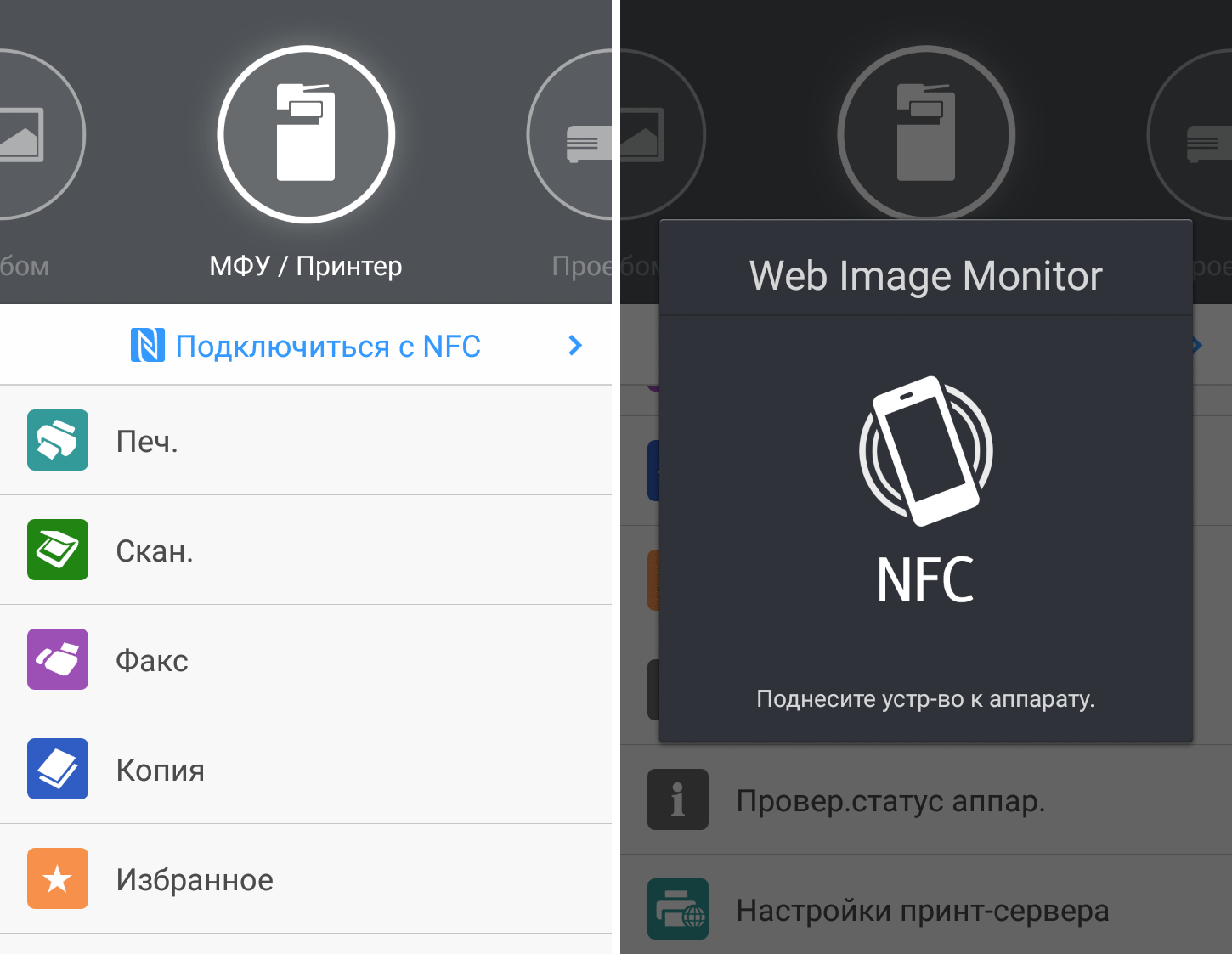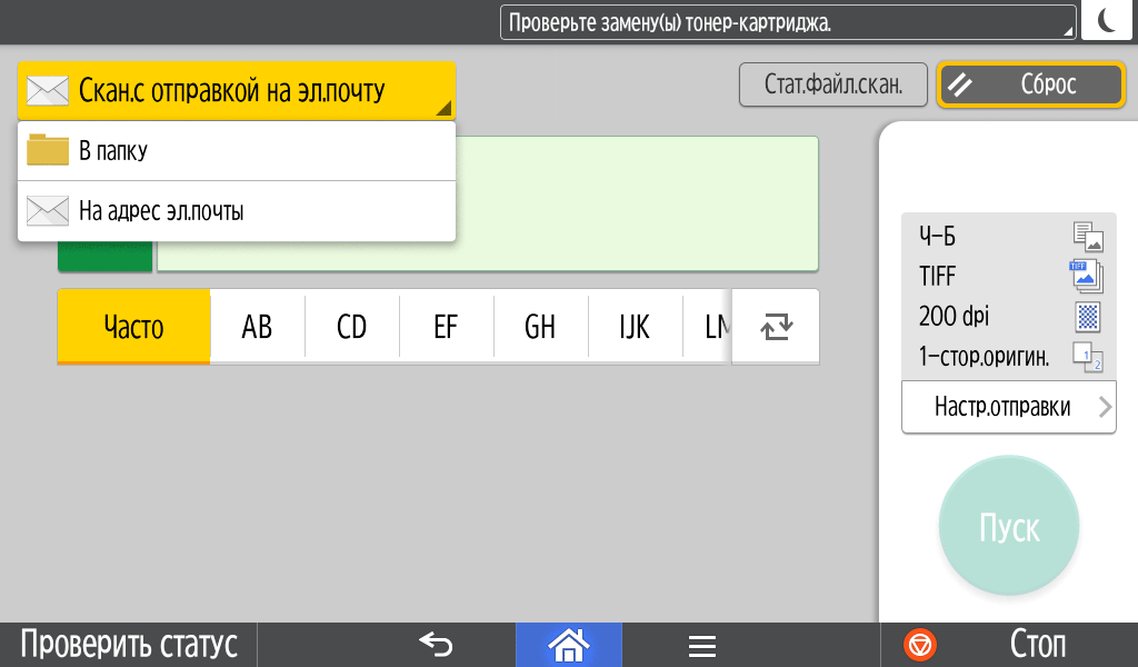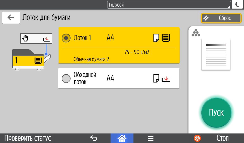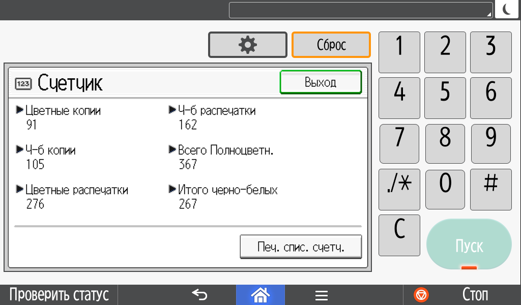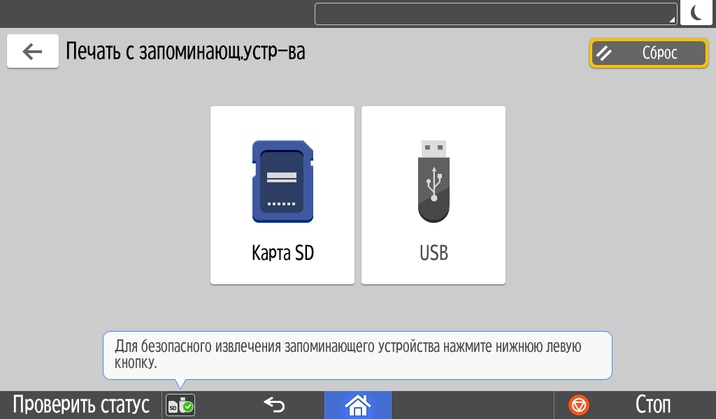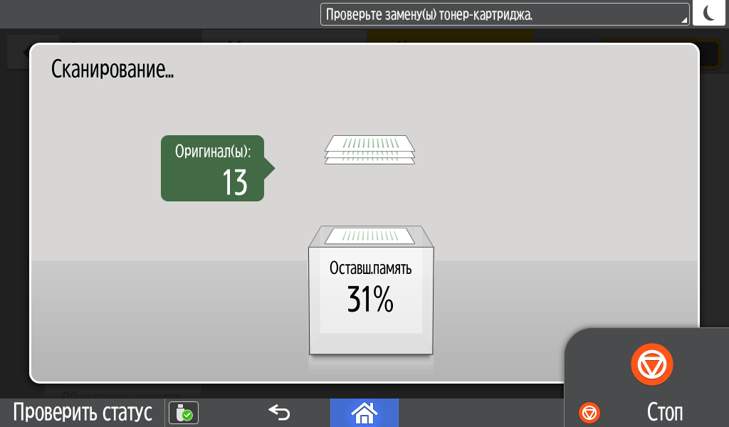 Для каждой из основных функций имеется соответствующий инструментарий: выбор параметров в виде крупных прямоугольных иконок, а также тот или иной набор управляющих кнопок. Кроме этого, в графическом виде отображаются и некоторые установки (например, цветной или монохромный режим копирования).