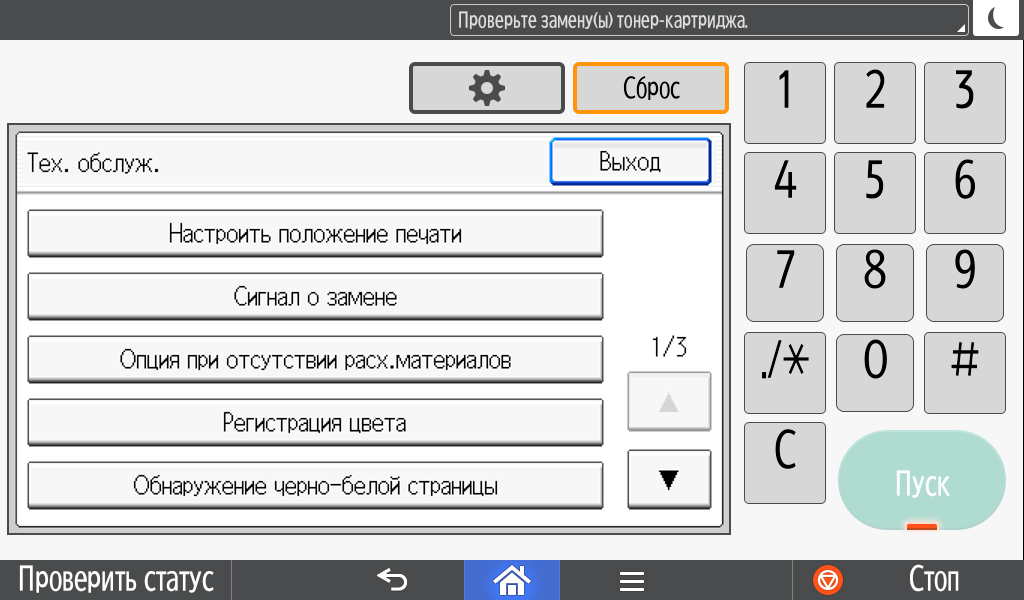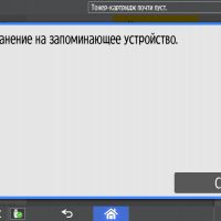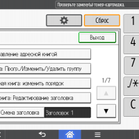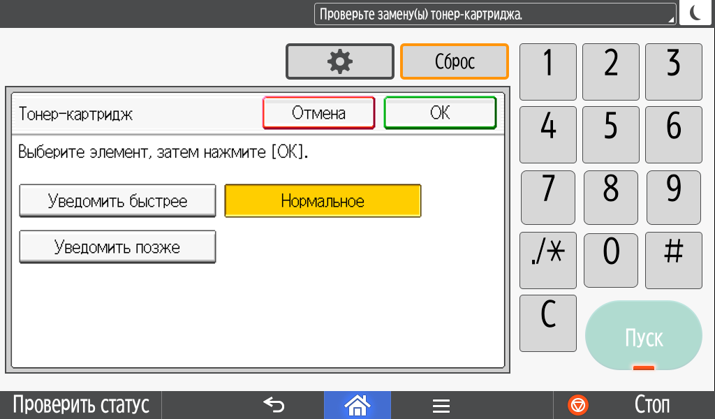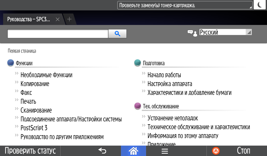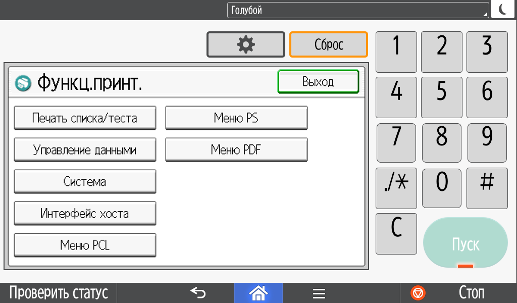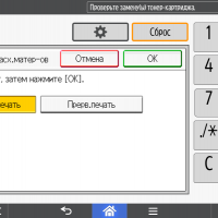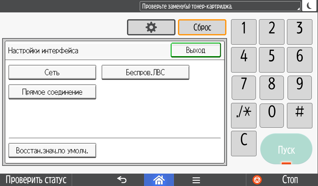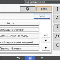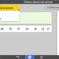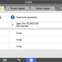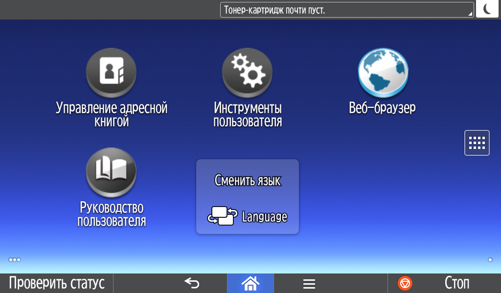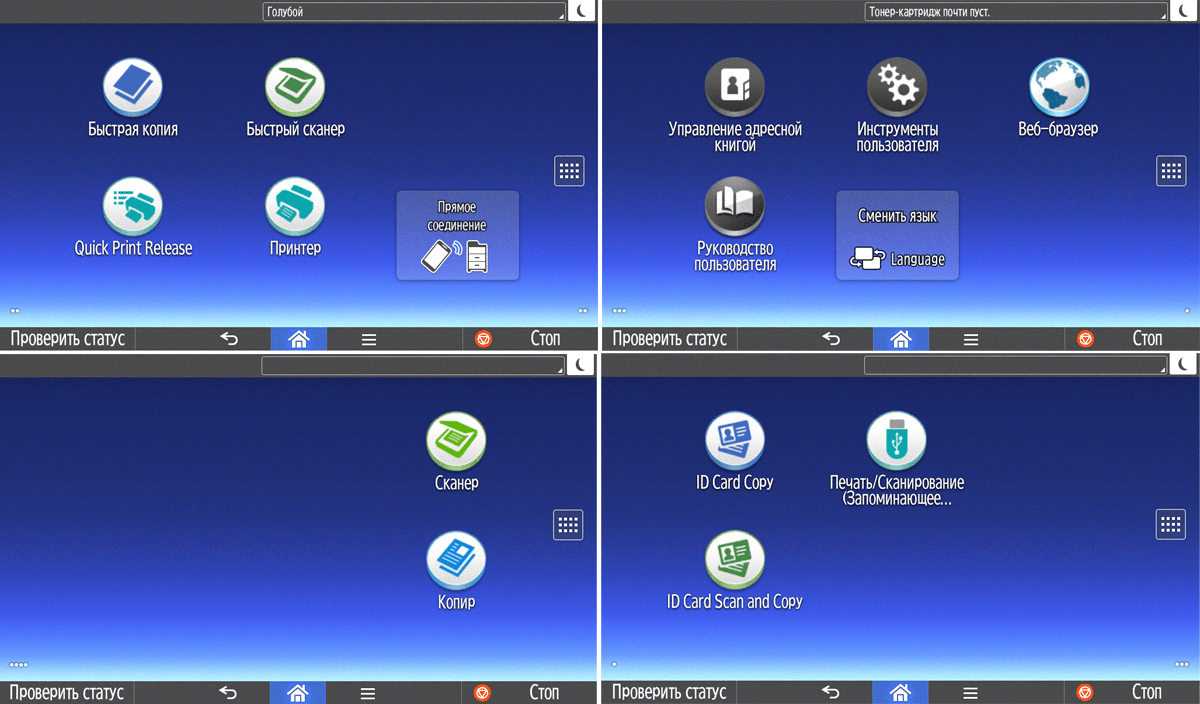 Каких-либо кнопок на панели нет вообще, всё взаимодействие осуществляется через сенсорный экран. Дополнительных индикаторов тоже немного: справа вверху — питания (синий, в режиме сна он медленно мигает), слева внизу — состояния (горит красным при возникновении ошибок и мигает желтым для предупреждений, например, о малом остатке тонера) и ввода данных (мигает в процессе получения заданий). Для моделей, имеющих модуль факса, над индикатором ввода данных есть еще один светодиод, отображающий состояния для этой функции.