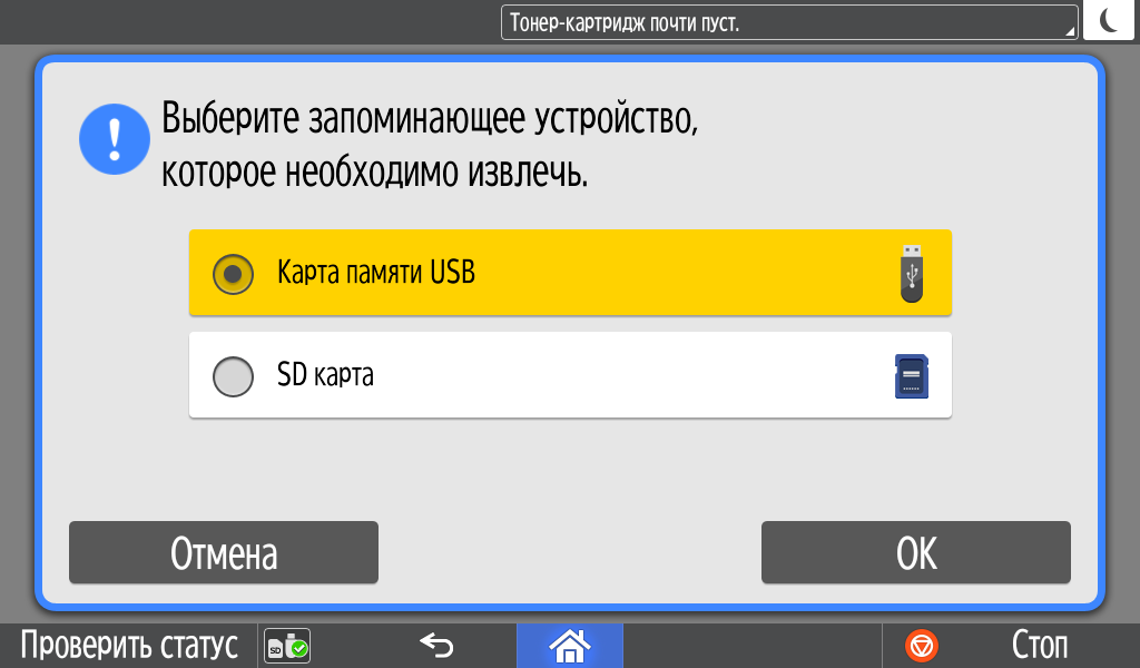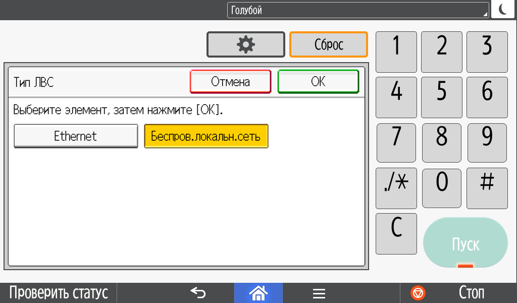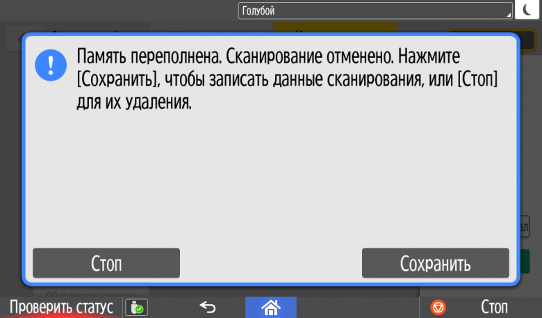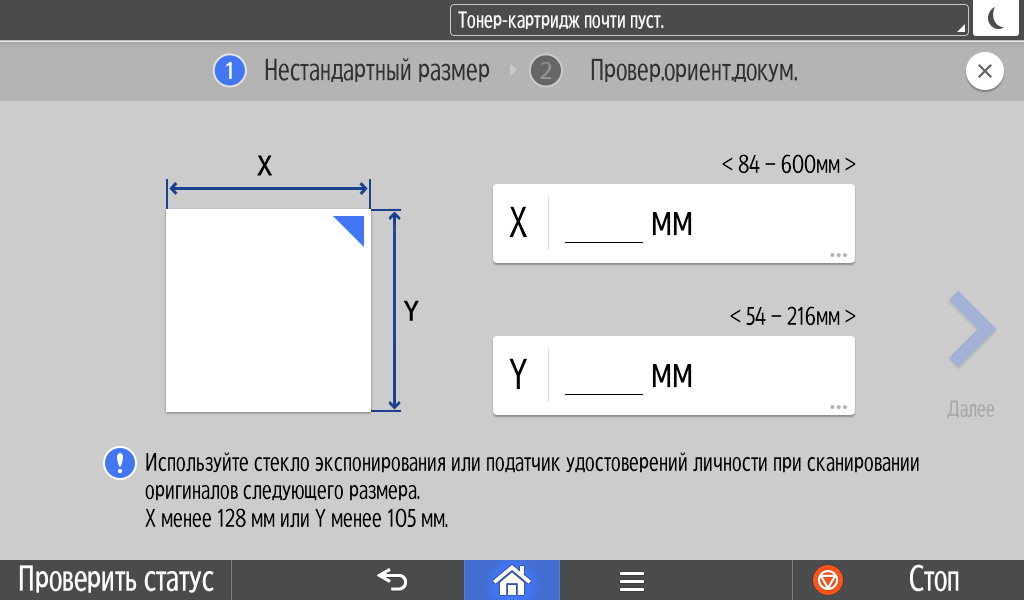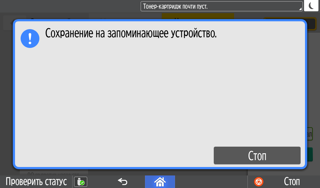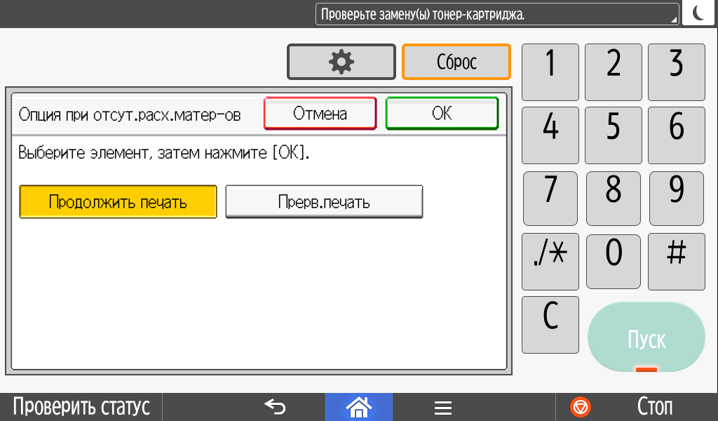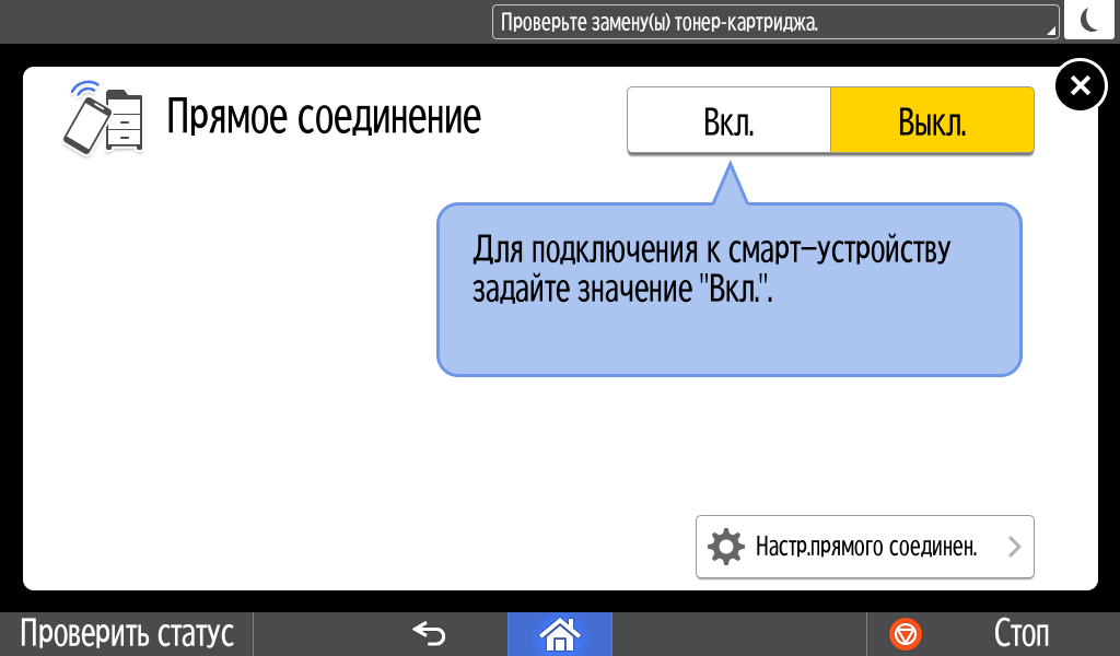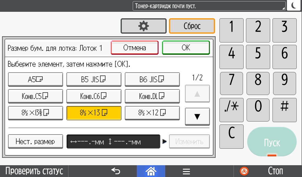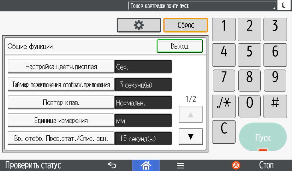 Каких-либо кнопок на панели нет вообще, всё взаимодействие осуществляется через сенсорный экран. Дополнительных индикаторов тоже немного: справа вверху — питания (синий, в режиме сна он медленно мигает), слева внизу — состояния (горит красным при возникновении ошибок и мигает желтым для предупреждений, например, о малом остатке тонера) и ввода данных (мигает в процессе получения заданий). Для моделей, имеющих модуль факса, над индикатором ввода данных есть еще один светодиод, отображающий состояния для этой функции.