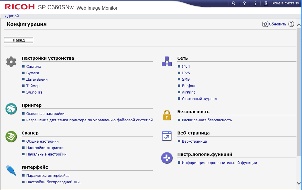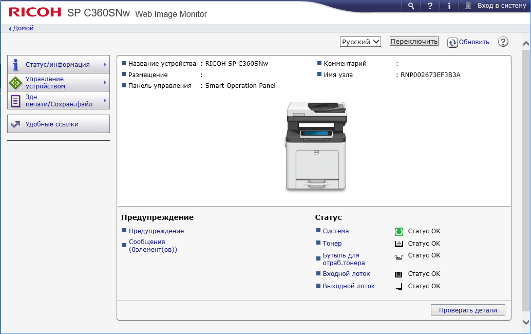 Мы рассмотрим работу с устройствами линейки на примере модели Ricoh SP C360SNw. Отсутствующая в индексе буква «F» как раз и показывает, что функции факса в этом аппарате нет, она имеется в Ricoh SP C360SFNw, а в Ricoh SP C361SFNw добавляется печать из веб-браузера и магазина приложений со смарт-панели, возможность базовой интеграции с софтом Basic Smart Integration, а также использование тонер-картриджей сверхвысокой емкости (о них скажем позднее). Отрадно, что потребителю предоставлена возможность выбора в соответствии со своими потребностями.