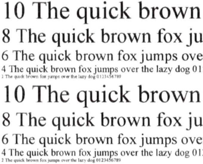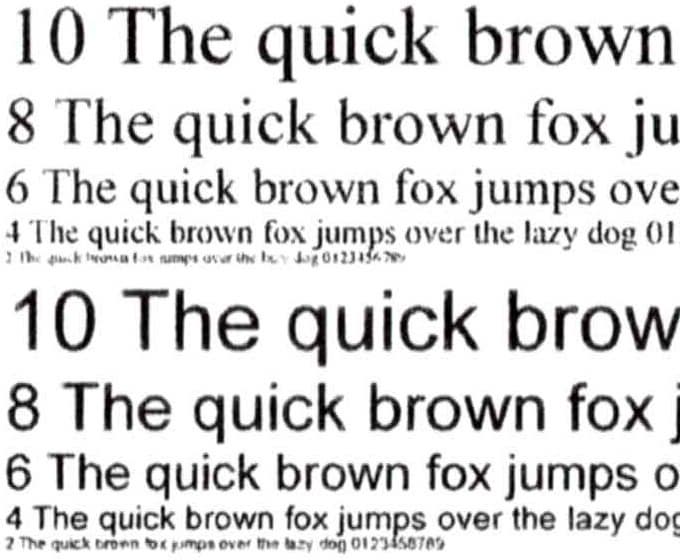 При печати передача текстовых образцов получается просто отличной: разборчивость начинается со 2-го кегля как для шрифтов без засечек, так и с засечками (на приведенных ниже сканах это полностью показать не удалось — сказываются и несовершенство сканера, и формат со сжатием). Контуры букв всех кеглей очень четкие, заливка плотная, растр не удается заметить даже при сильном увеличении.