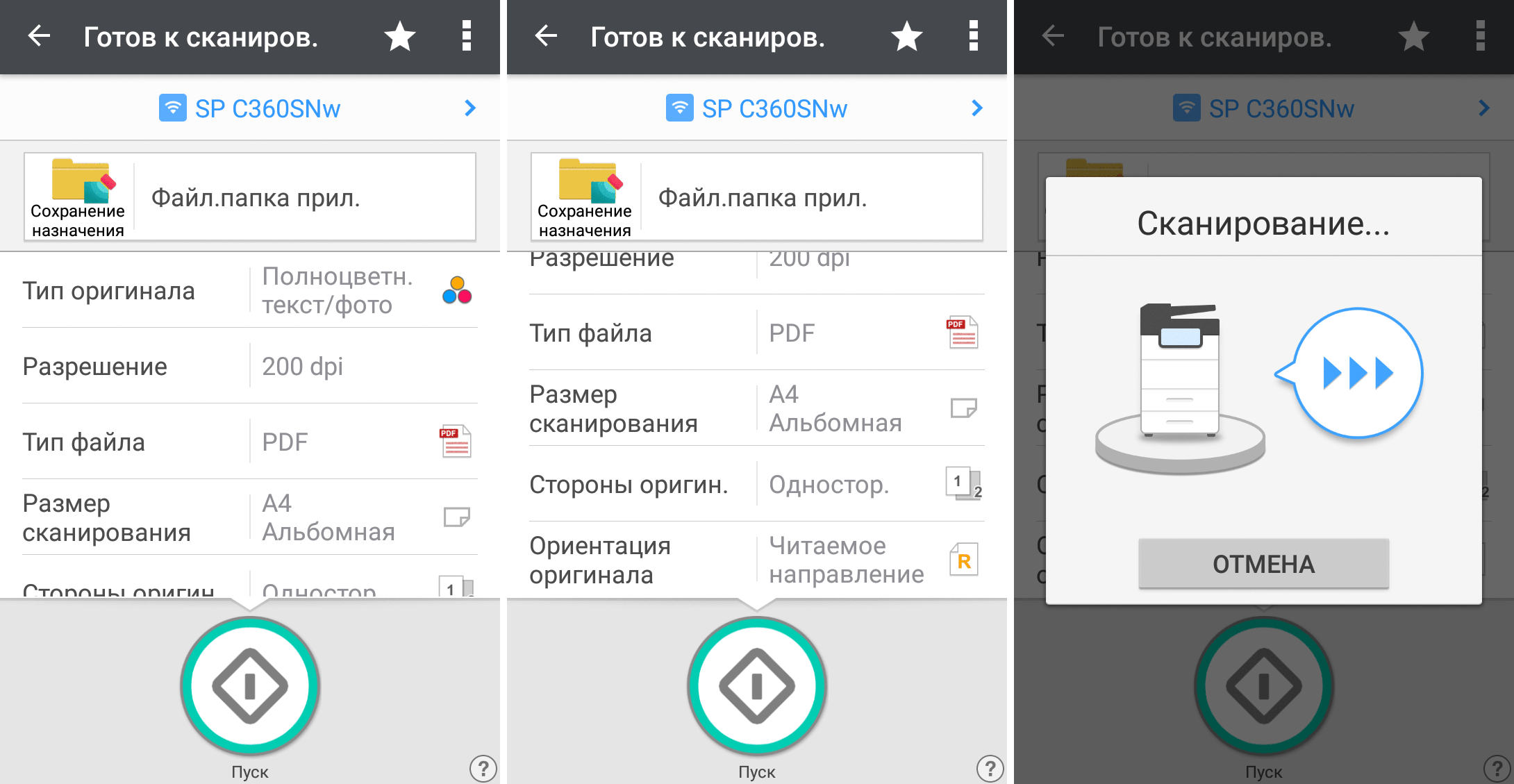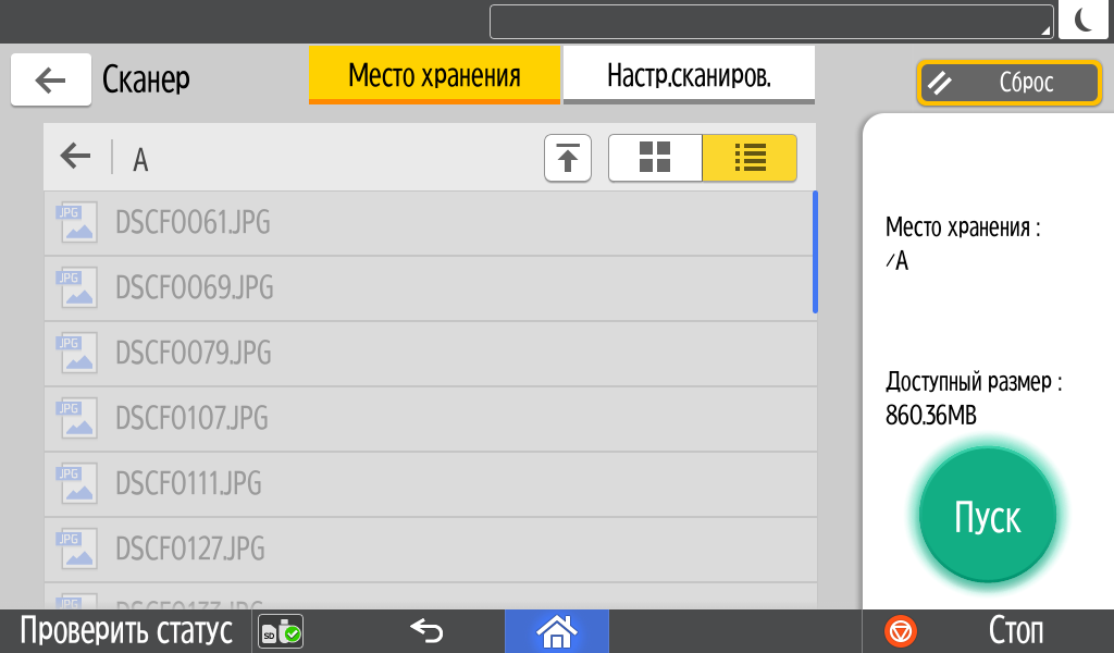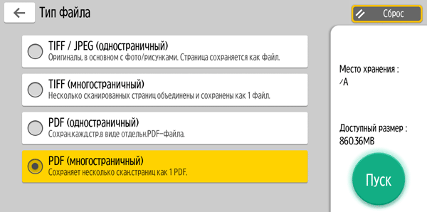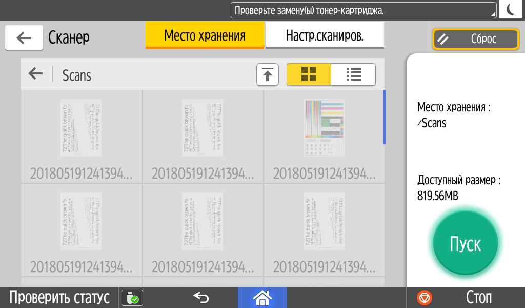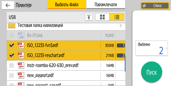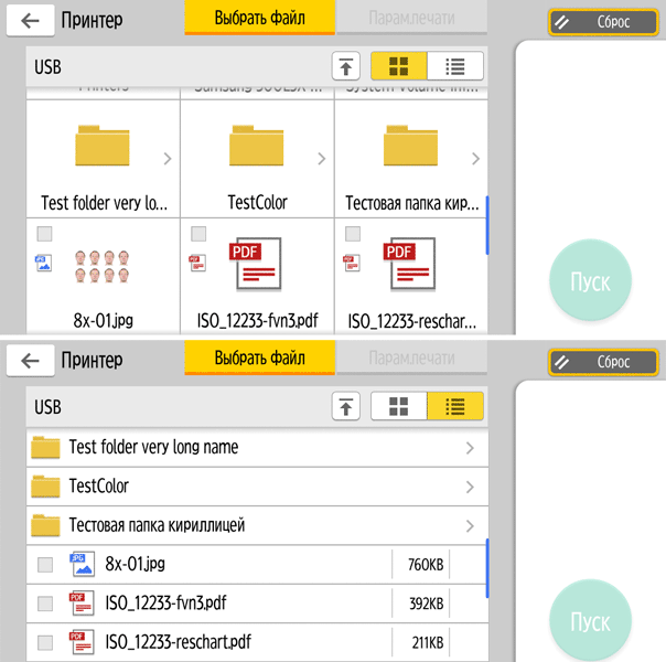 Для работы с USB-flash задавалось сохранение в виде многостраничного PDF-файла, время замерялось от нажатия кнопки «Пуск» до автовозврата в окно с содержимым носителя, при сканировании с компьютера (драйвер TWAIN) — от старта кнопкой приложения до появления последней страницы в его окне.