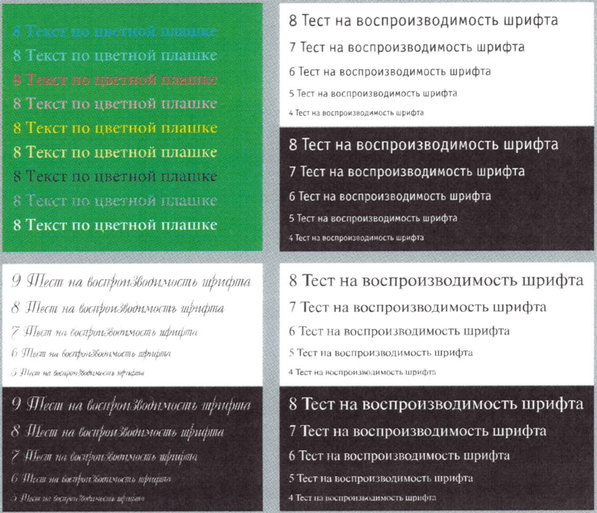Качество печати тестовой полосы нельзя оценить однозначно. Лучше всего получаются тексты — при печати нормальной и вывороткой шрифты с засечками и без читаются от 4-го кегля, лишь декоративный шрифт реально читается с кеглем от 5-го нормальный и от 7-го вывороткой.