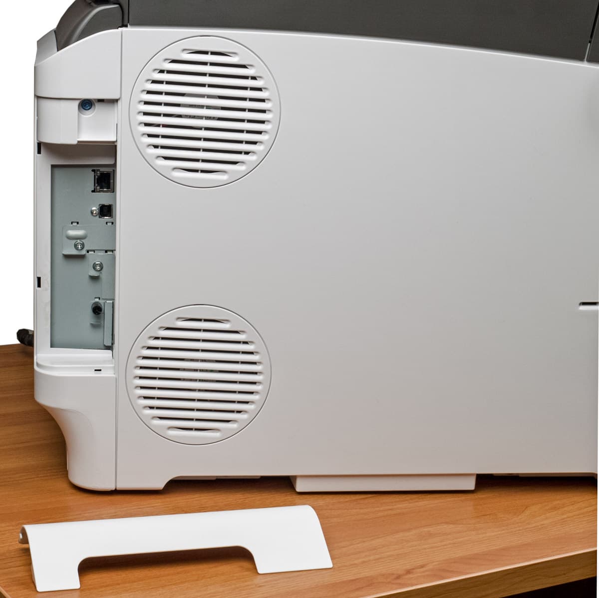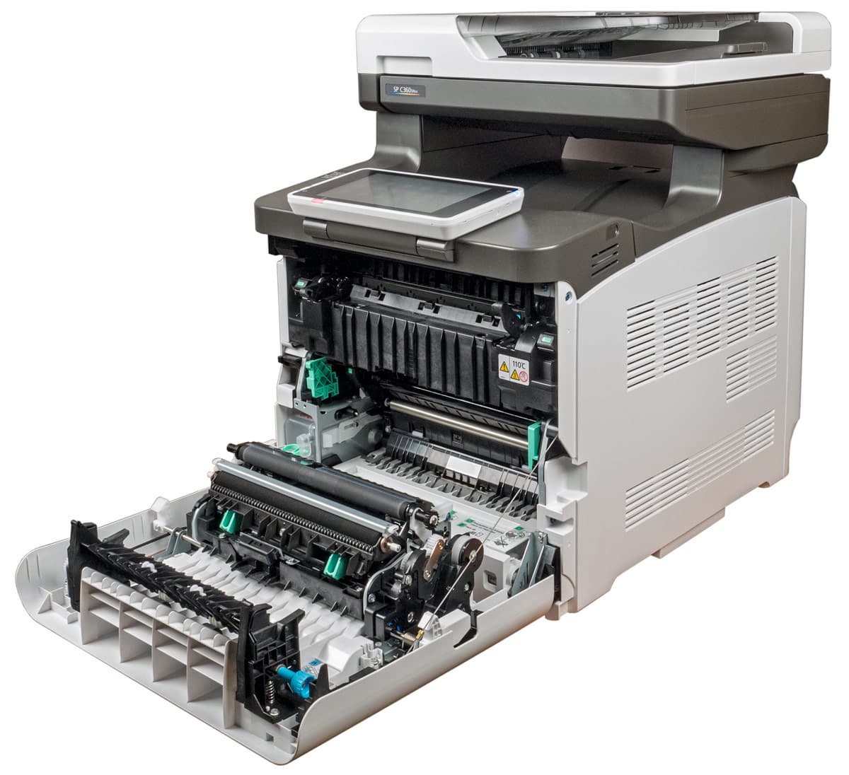 Вся передняя панель также откидывается вперед, открывая доступ к механизмам подачи бумаги в случае застревания и некоторым заменяемым частям, включая бункер для отработанного тонера. Фиксируется эта крышка расположенной справа защелкой.