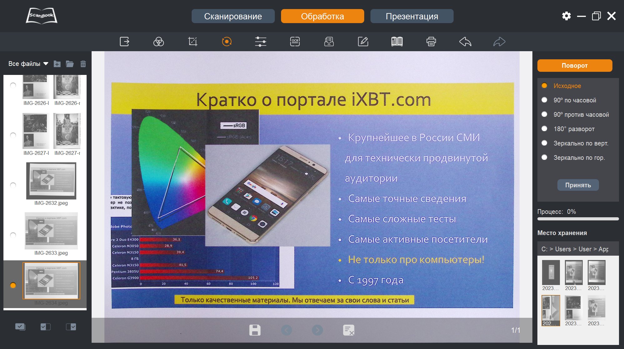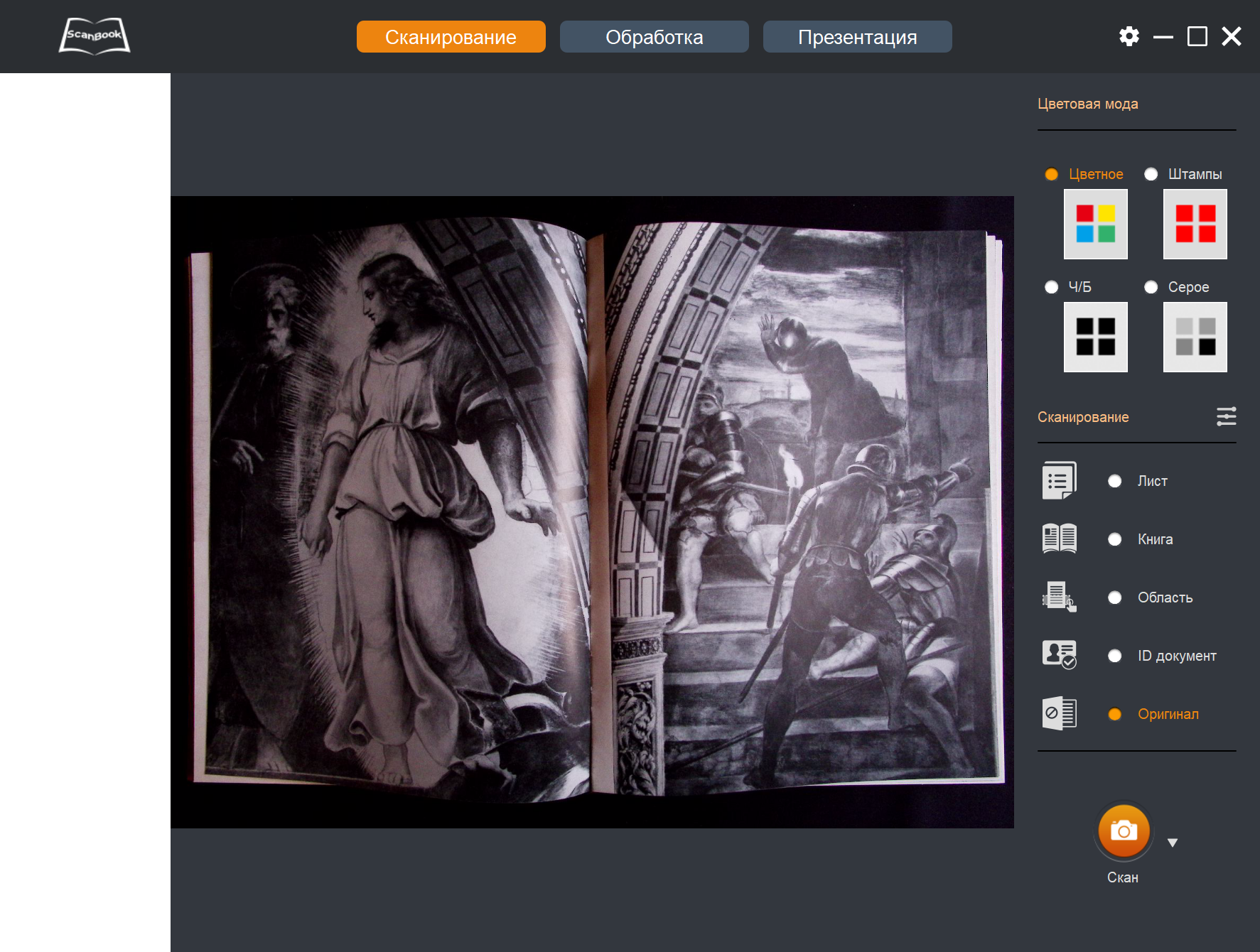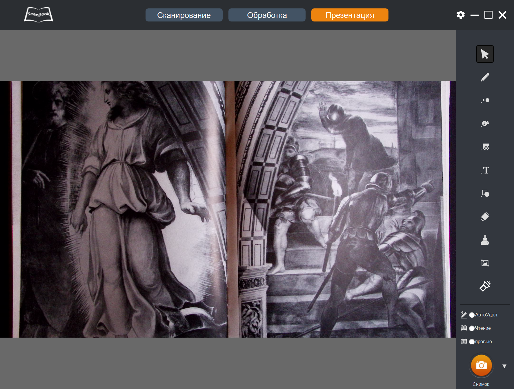 Теперь, когда снимки-сканы получены, с ними можно что-то сделать — переходим к пункту «Обработка» в верхней строчке окна программы ScanBook.