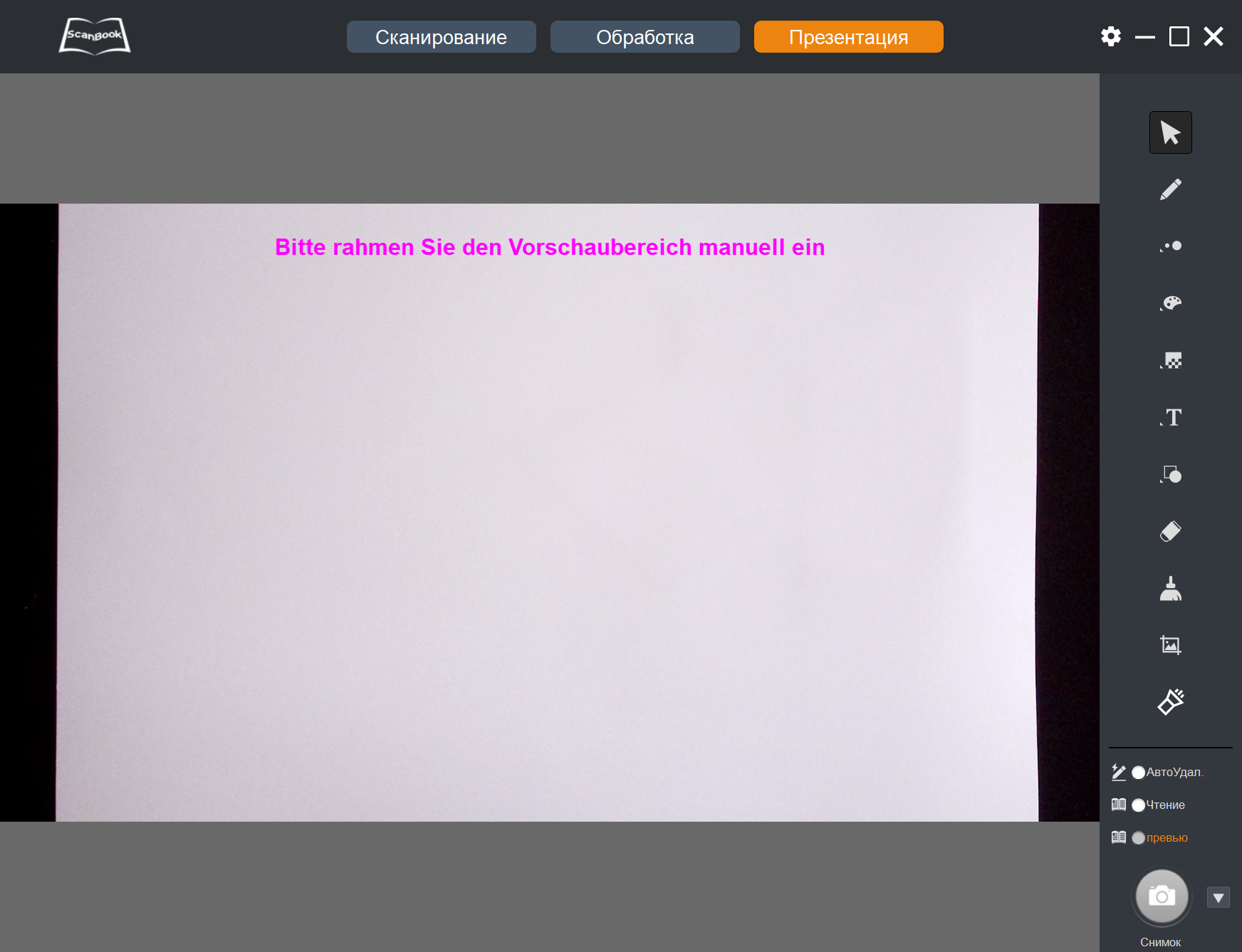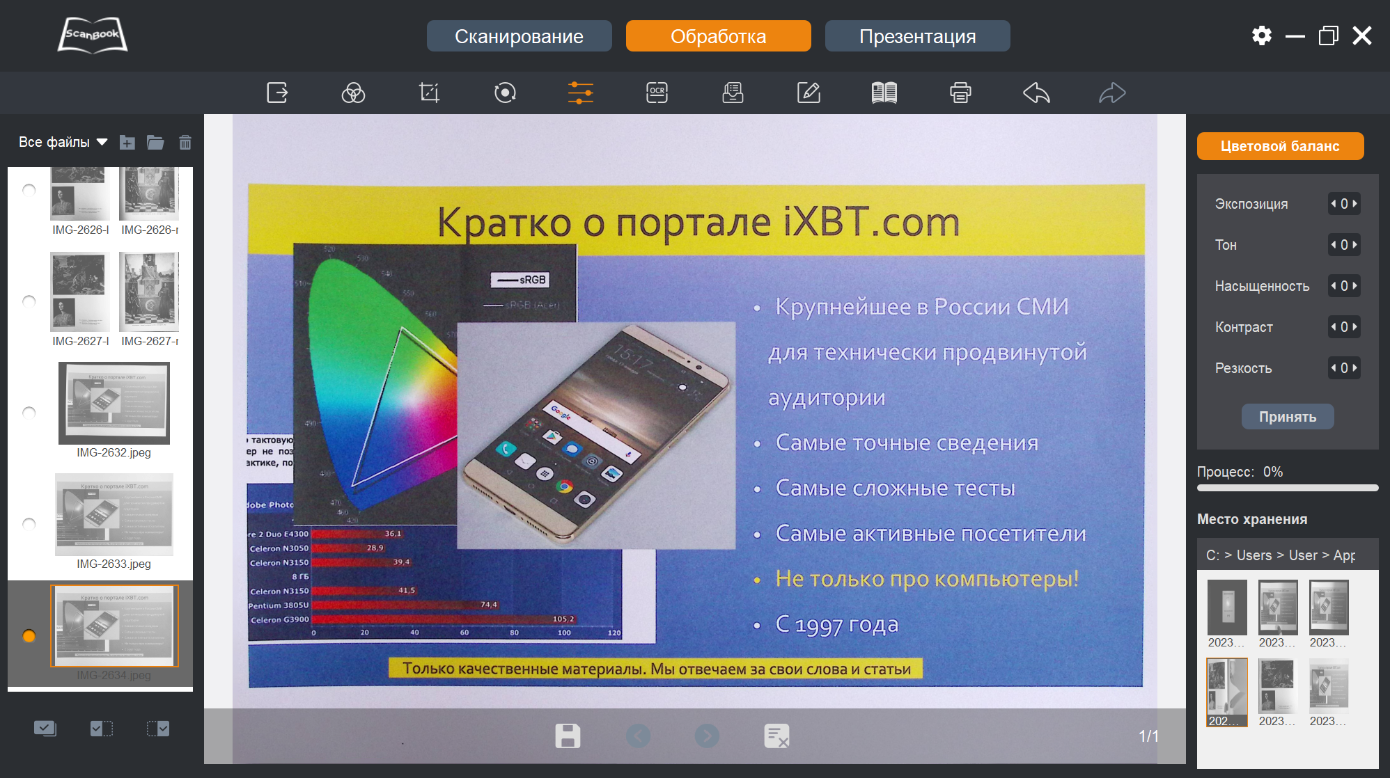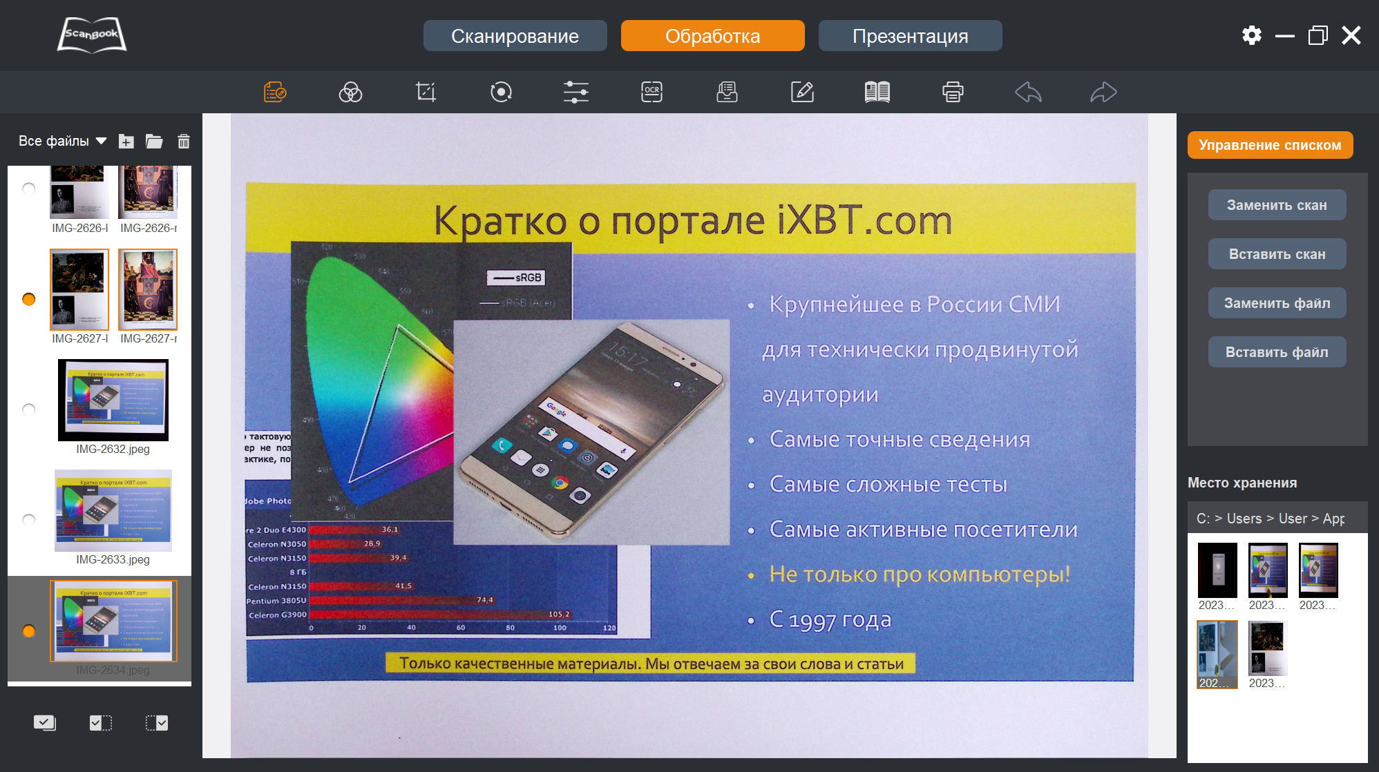Теперь, когда снимки-сканы получены, с ними можно что-то сделать — переходим к пункту «Обработка» в верхней строчке окна программы ScanBook.