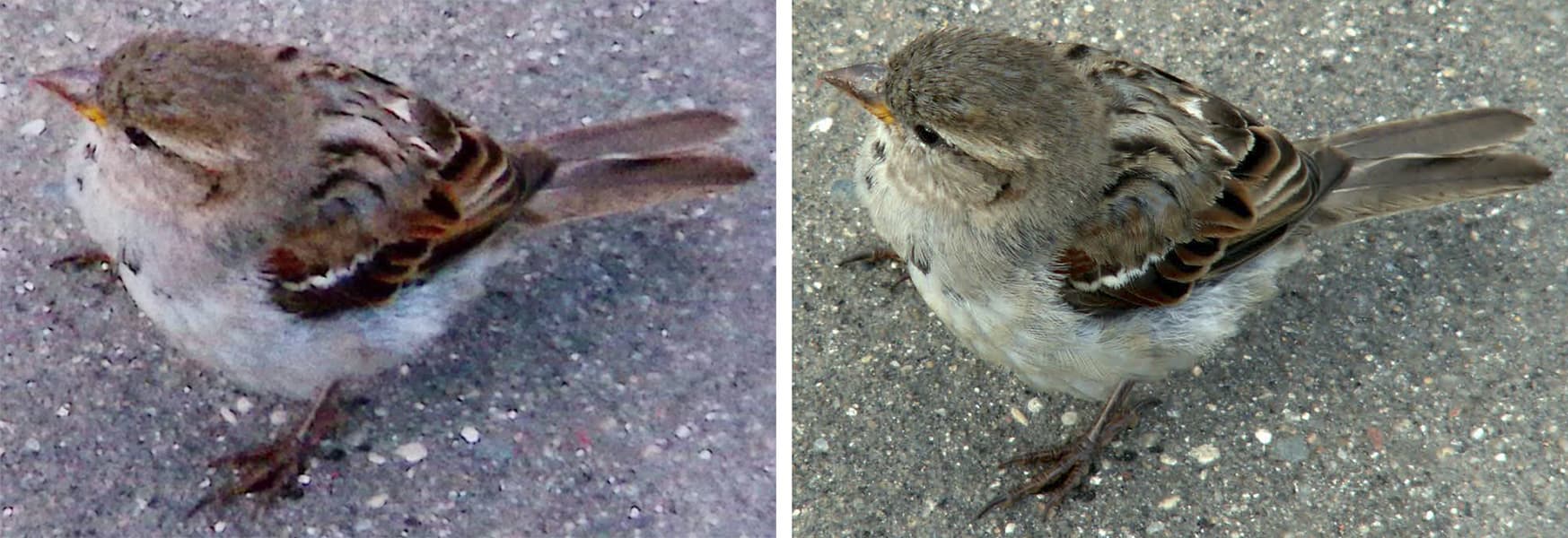 Первое, что бросается в глаза — существенное искажение цветопередачи, которое до некоторой степени можно поправить подбором внешнего освещения (конечно, когда есть такая возможность). А если присмотреться, то замечаешь и последствия более низкого разрешения снимка: перышки воробья, хорошо заметные на правом скане, слева получились размытыми, и это исправить уже нельзя.