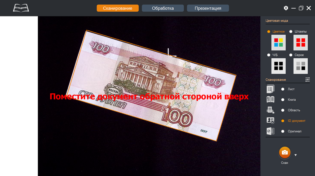 С денежной купюрой получилось гораздо лучше, хотя и не идеально: рамка немного не соответствует контуру оригинала. После нажатия «Скан» предлагается перевернуть документ: