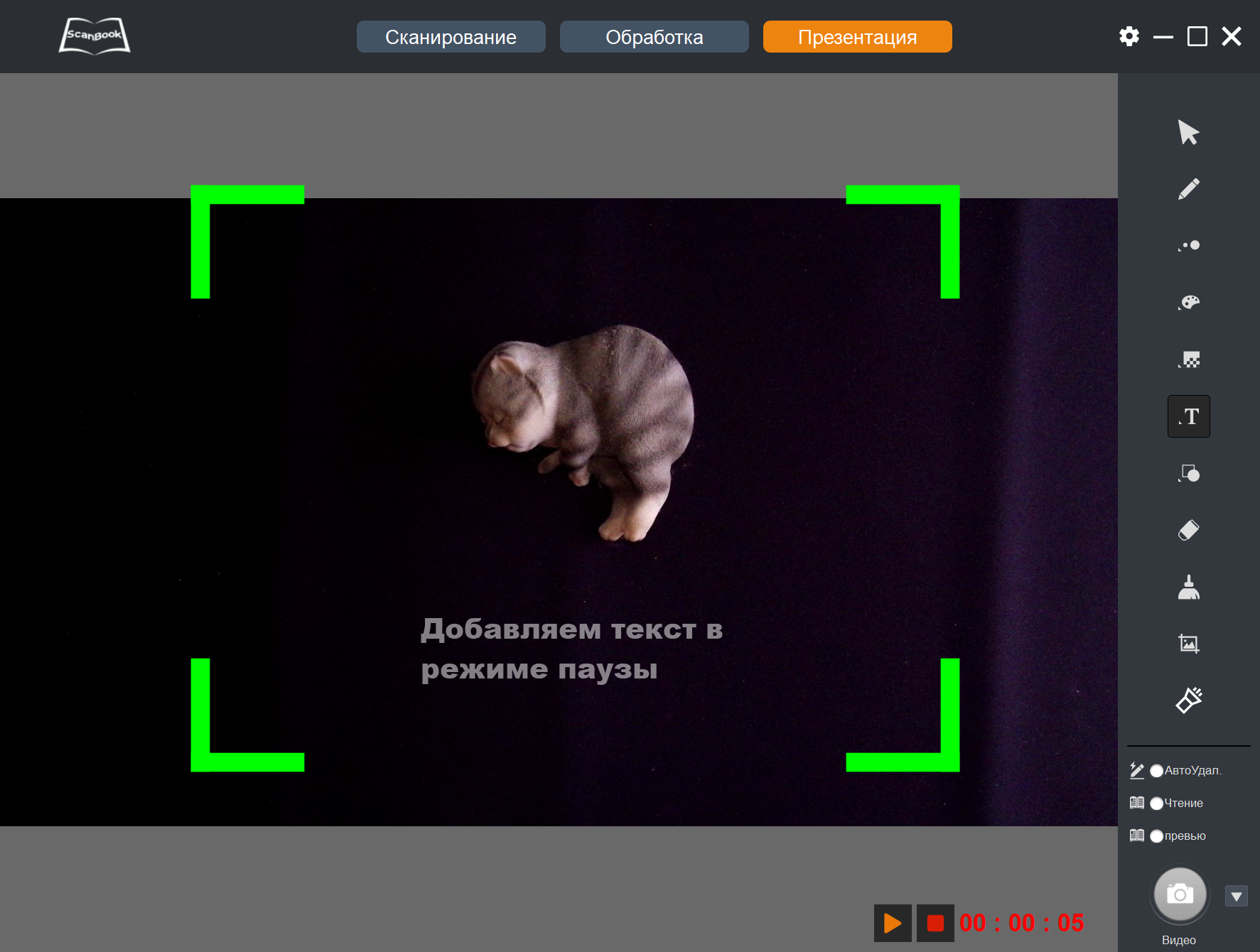 Но надо понимать, что фигуры или текст накладываются на транслируемое с камеры изображение — работать можно вообще без какого-то исходного документа, рисуя на черном фоне коврика или на белом, если положить чистый лист. Каким-то образом изменять попадающее в объектив изображение (документ или иной объект) в режиме презентации нельзя.