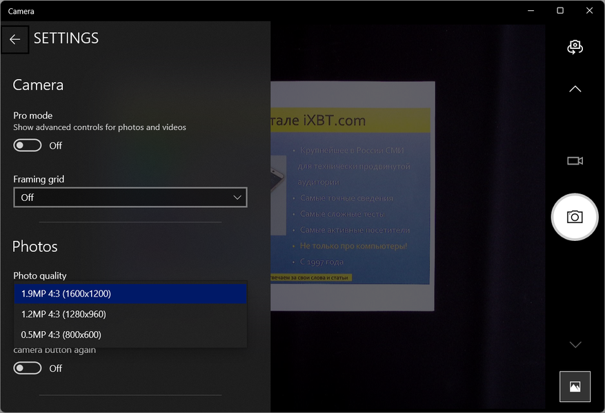 По умолчанию используется максимальное заявленное значение 4608×3456, с ним качество снимка-скана будет наилучшим, но и размер в байтах получится очень большим (речь сейчас не про сохранение в виде файла — здесь многое будет зависеть от выбранного формата, а про объем ОЗУ, потребный для размещения полученного с камеры изображения), и если нужно оцифровать и обработать много страниц, то рано или поздно начнутся «тормоза», связанные с ограниченностью ресурсов компьютера. Если же задать наименьшее значение 1600×1200, то потери качества могут, например, привести к проблемам с распознаванием текста. Однозначных рекомендаций по выбору разрешения быть не может, в каждом конкретном случае надо пробовать.