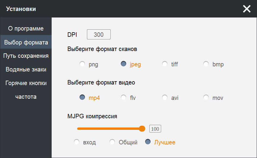 Имеется настройка, обозначенная как «MJPG компрессия», но это не Motion JPEG — влияет она на сохранение изображений, да к тому же обозначает не степень сжатия (чем она больше, тем хуже получится сохраненное изображение, но меньше файл), а качество: максимум в 100% дает самую лучшую картинку и файл наибольшего размера. Не исключено и влияние на видео, но проверить это в условиях, предоставляемых программой ScanBook, практически невозможно.