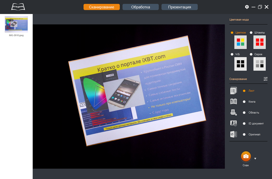 Для оригинала «Лист» происходит автообрезка по внешнему контуру — для этого и нужен черный коврик, цвет которого помогает определить границы документа, обозначаемые в программе рамкой оранжевого цвета. Для снимка происходит автоматический поворот изображения в нормальную позицию.