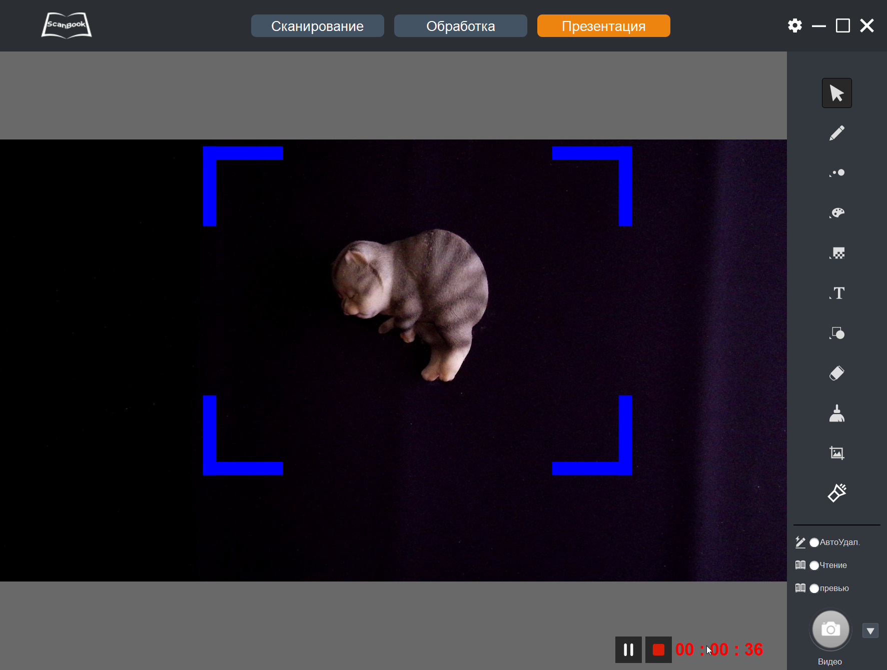 То есть во время презентаций не получится оперировать документами с размером, близким к А3, и это порой может стать критичным. Конечно, если речь про трансляцию изображения со сканера на какой-то внешний экран через компьютер, то не обязательно выбирать режим «Презентация» — можно показывать и из «Сканирования», а то и вообще из стандартной оснастки «Камера» Windows (см. выше), но при создании видеоролика такие оригиналы окажутся обрезанными по краям.