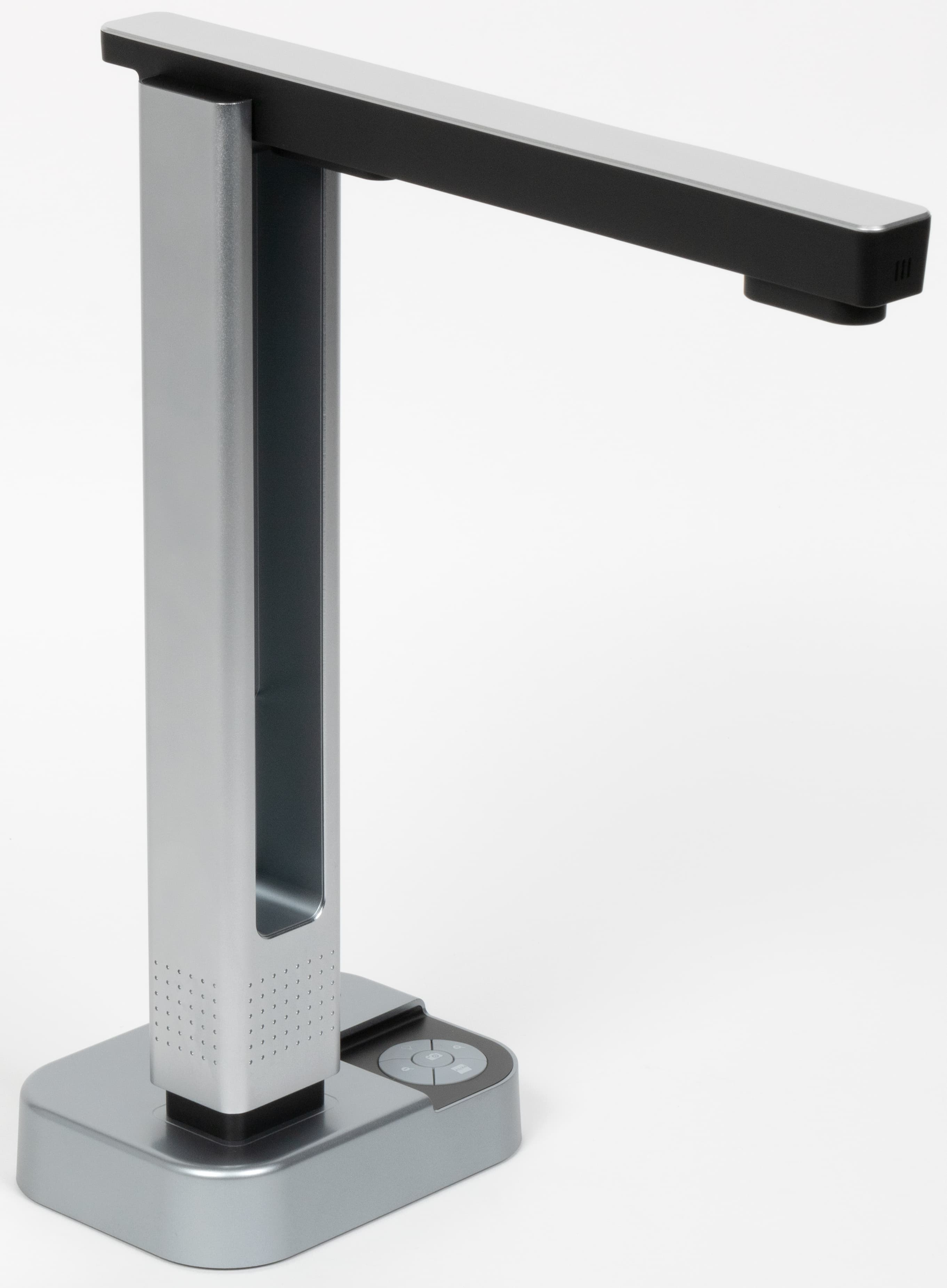 Сканер состоит из утяжеленной подставки, на которой расположена панель управления и разъемы, а также вертикальной стойки с откидной планкой, в которой смонтированы камера и элементы подсветки. У этой планки есть два фиксированных положения: рабочее, в котором она располагается горизонтально, и для транспортировки/хранения — прижата к стойке.