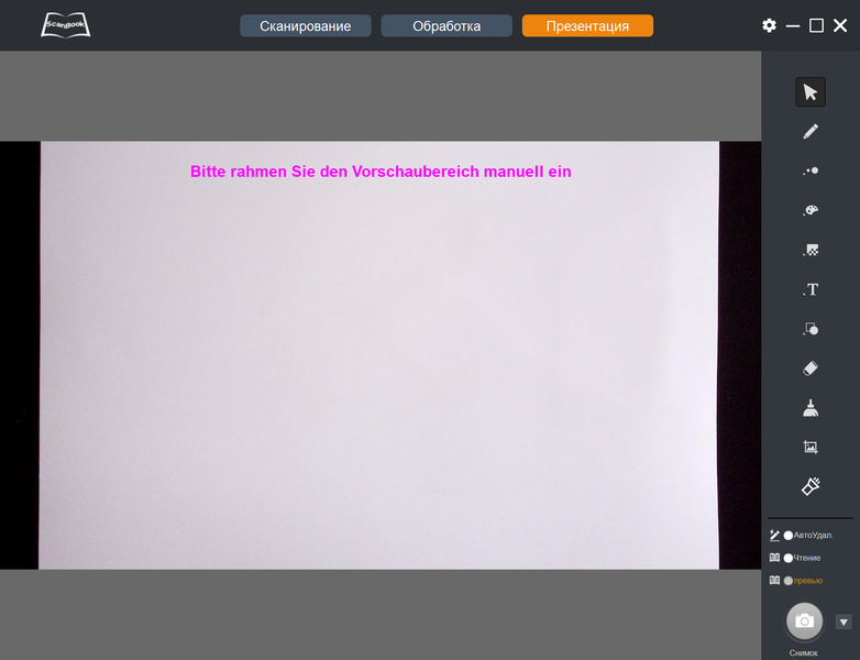 Для документов на отдельных листах можно задать автопросмотр — после нажатия «Скан» на 3-4 секунды будет появляться снимок, а еще есть функция, почему-то обозначенная на немецком языке: «Schwarze Ränder entfernen», что в переводе означает удаление черных краев (установлено по умолчанию).