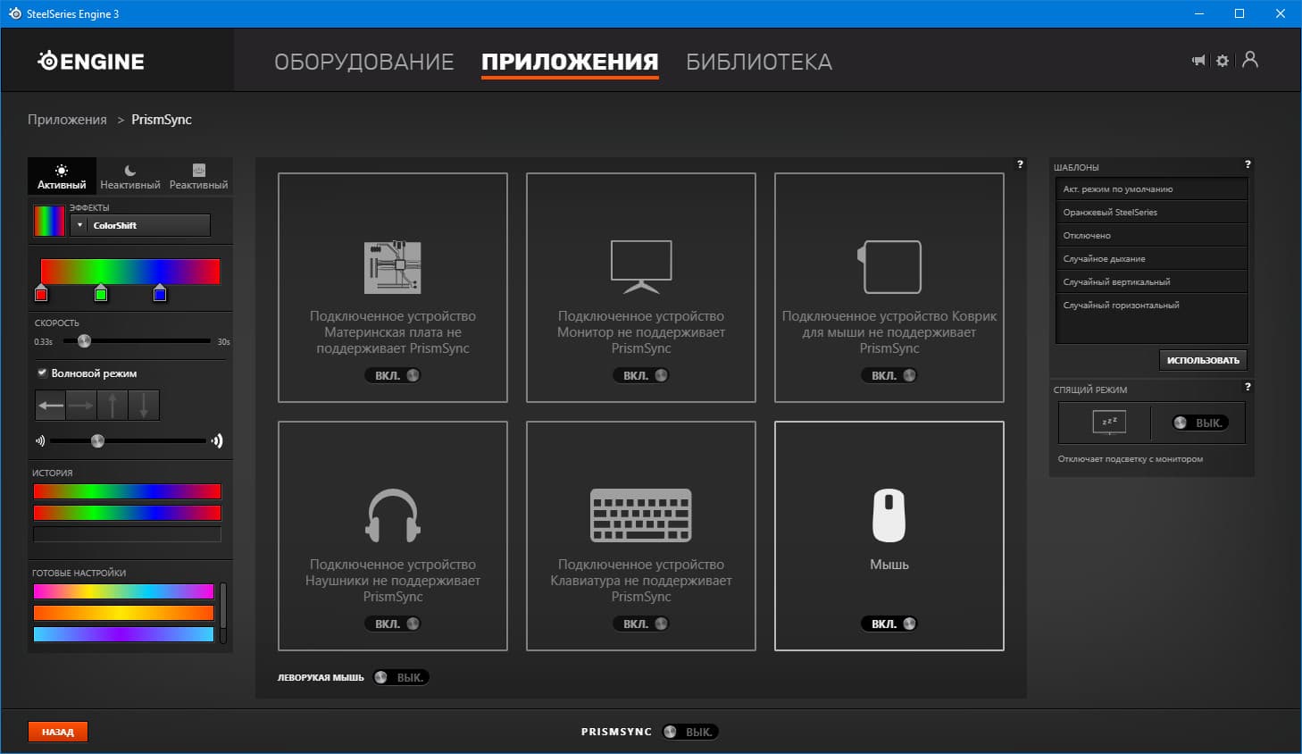 Помимо игровых модулей, среди приложений встречаются и системные. Например, PrizmSync синхронизирует RGB-подсветку всей компьютерной периферии, от системной платы до аудиогарнитуры. К сожалению, как мы уже отмечали, в нашей системе имеется лишь одно поддерживаемое устройство — рассматриваемая мышка.