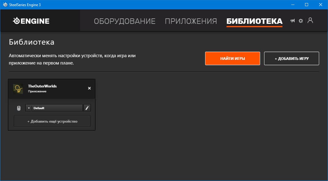 Наконец, последняя вкладка, Библиотека. В ней появляются пресеты поведения мышки, когда приложение обнаружит поддерживаемые игры. В нашем случае таких игр не нашлось, но ведь любую игру и вообще любую программу разрешается добавить вручную.
