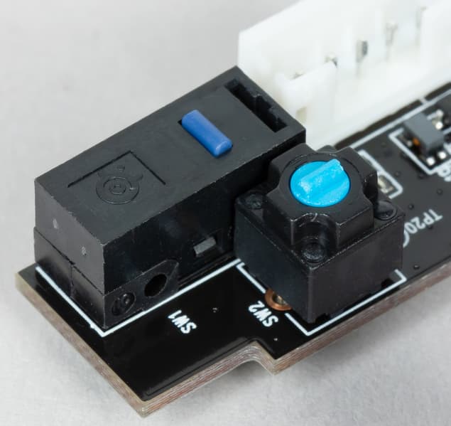 Находящейся над колесиком кнопкой перебираются варианты чувствительности датчика, они задаются в настройках мышки. О переключении уровней чувствительности сигнализирует белый светодиод, врезанный между колесом и кнопкой: количество вспышек светодиода соответствует порядковому номеру выбранной предустановки чувствительности.