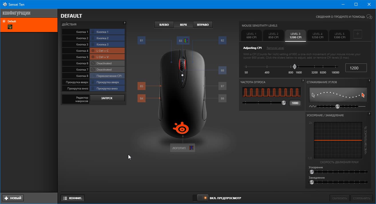 Другие функции более понятны: частота опроса, варьирующаяся в пределах от 125 до 1000 Гц, а также ускорение и замедление, настройка которых отображается в виде кривых.