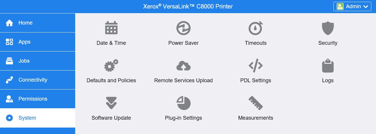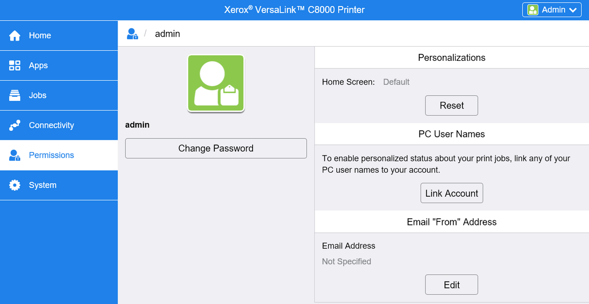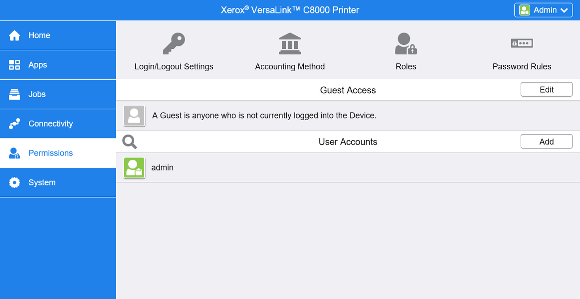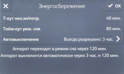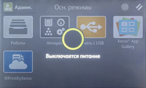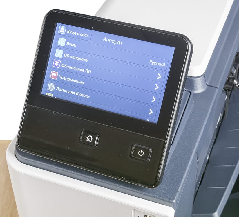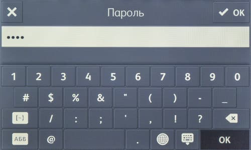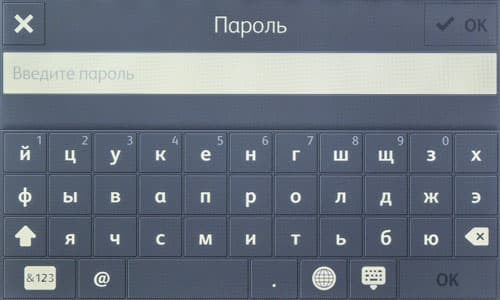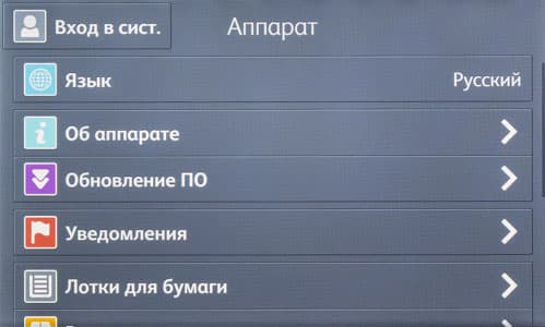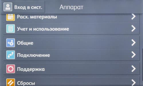 В левом верхнем углу кнопка входа в систему, исходный пользователь один: admin, по умолчанию пароль для него тот же, что и в других аппаратах Xerox — «1111». Можно менять этот пароль и заводить новых пользователей с собственными настройками главного экрана и некоторых других параметров.