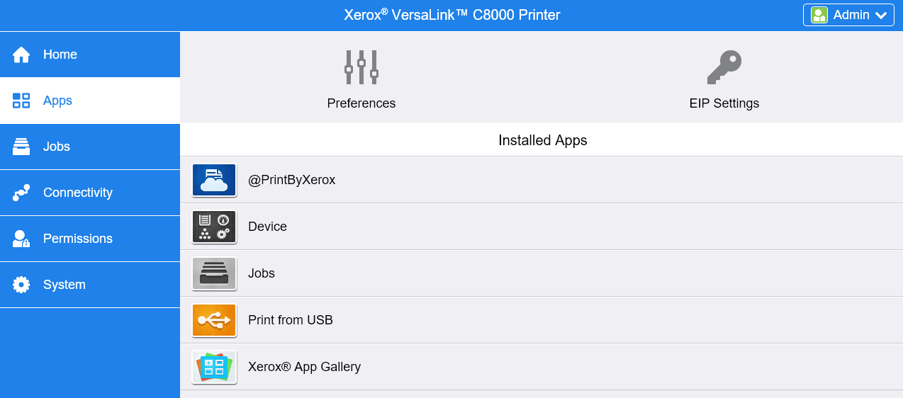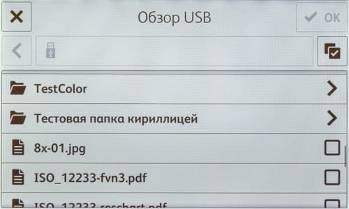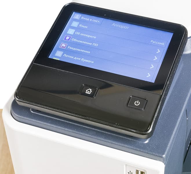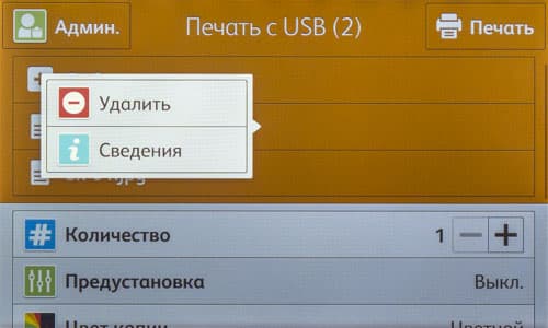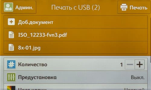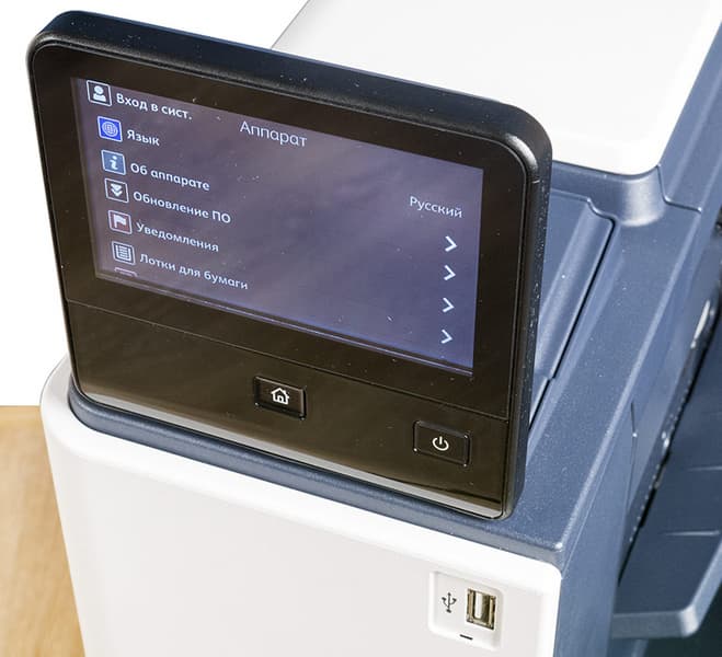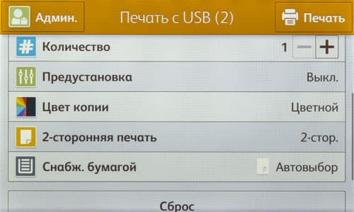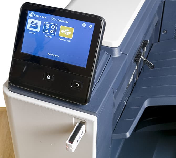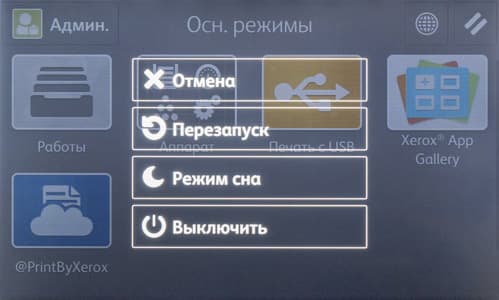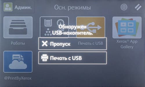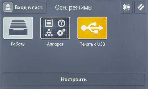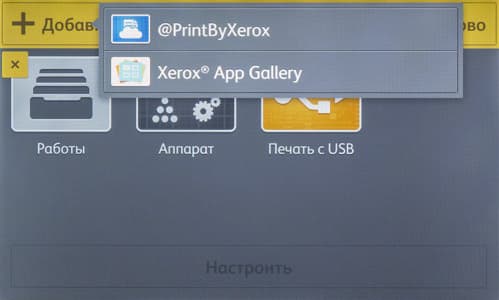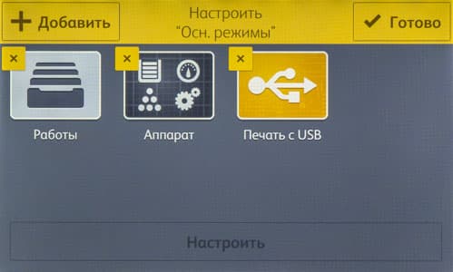 Здесь имеются три крупные кнопки-иконки «Работы» (список выполненных и сохраненных заданий и операций), «Аппарат» (с настройками) и «Печать с USB» (подробнее расскажем ниже). К ним по нажатию «Настроить» в нижней части экрана можно добавить еще две: «@PrintByXerox» (печать с мобильных устройств) и «Xerox App Gallery» (установка приложений, обеспечивающих новые функции и возможности). Можно изменить и взаимное расположение этих иконок, а также удалить любую из них.