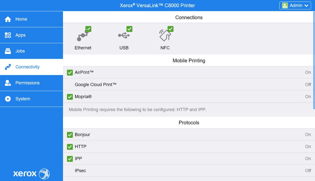 В базовой конфигурации принтеры оснащены интерфейсами USB 3.0 для локального и Ethernet для сетевого подключения. Возможна автономная печать со сменных USB-накопителей.