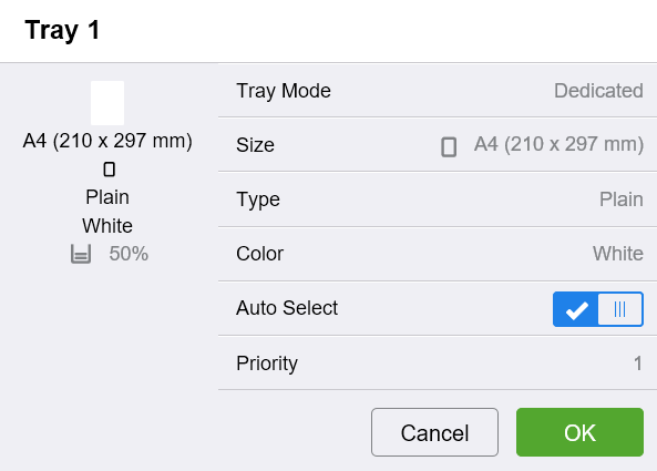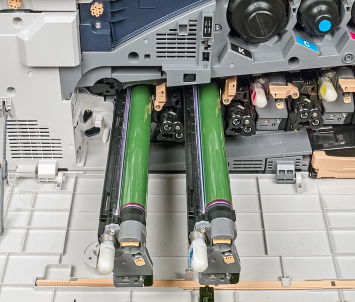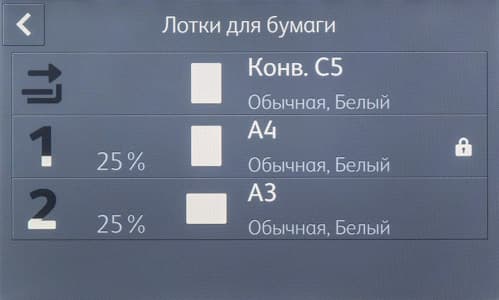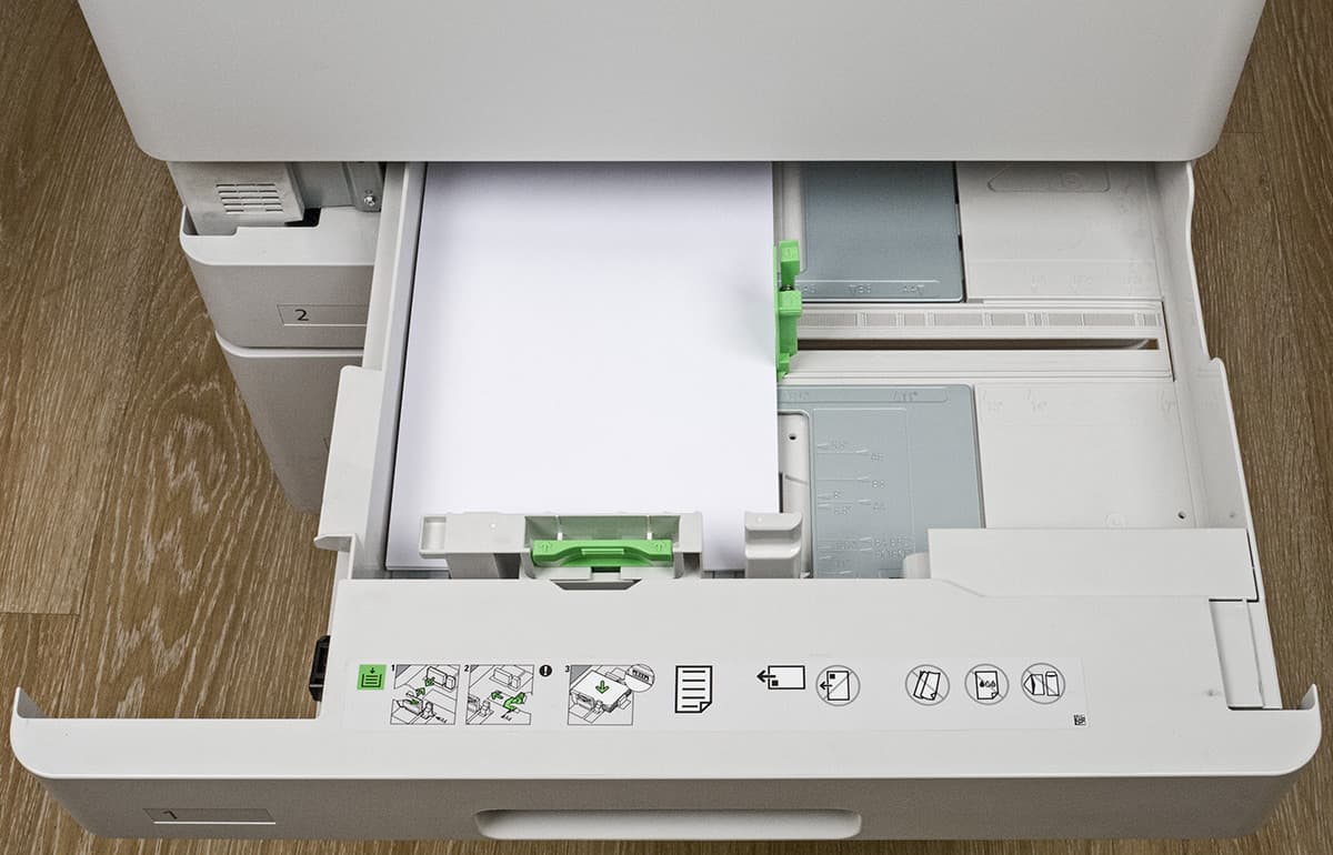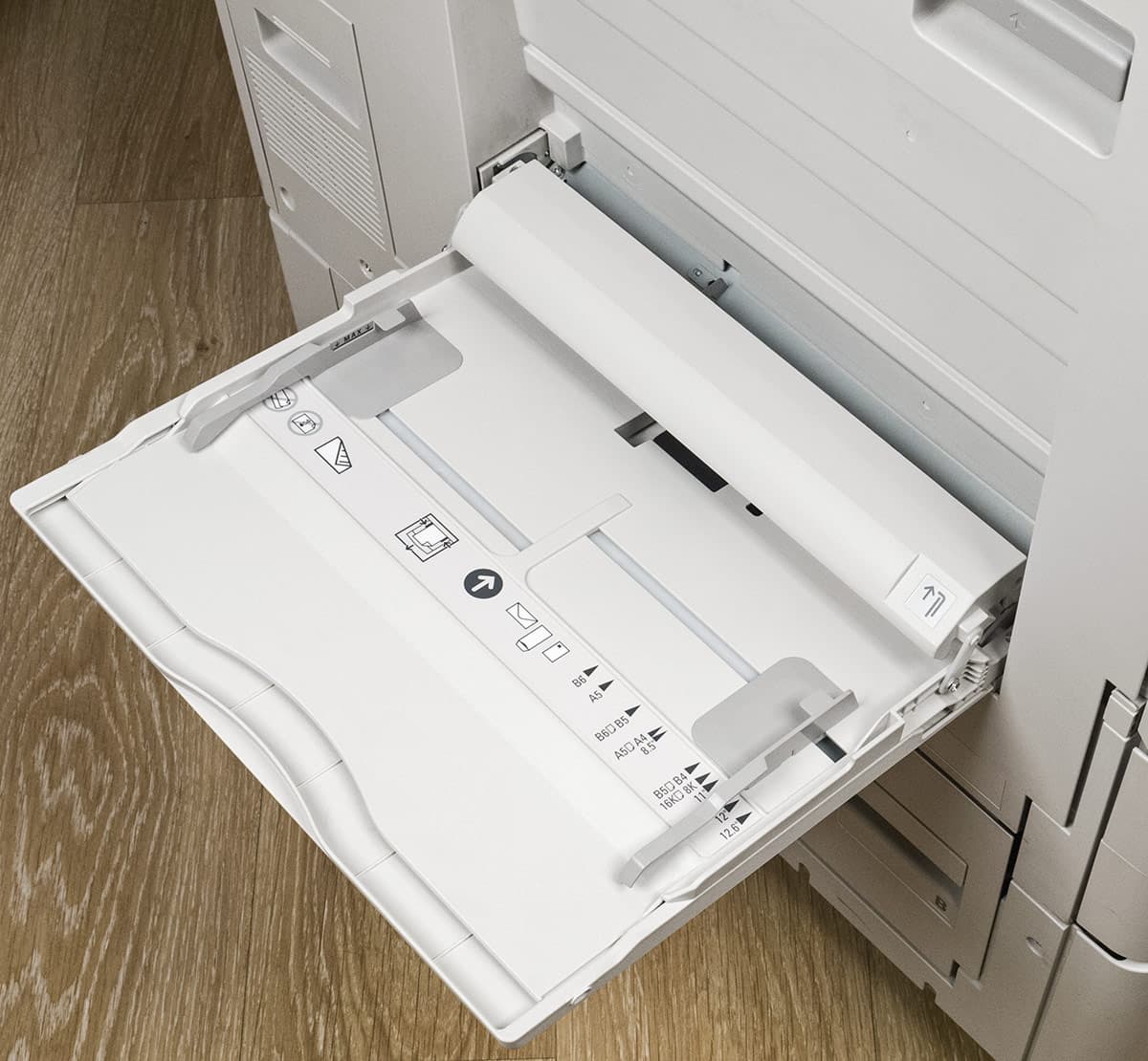 В нижней части принтера расположены два штатных выдвижных лотка вместимостью по 520 листов бумаги (здесь и далее — плотностью 80 г/м², если не указано иное). Оба они рассчитаны на бумагу с плотностью до 300 г/м², но немного отличаются по максимальному формату: если верхний (первый) рассчитан на листы форматом до А3 включительно, то второй можно использовать и для листов SRA3 (320×450 мм). Минимальный стандартный формат для этих лотков — А5 (148×210 мм).