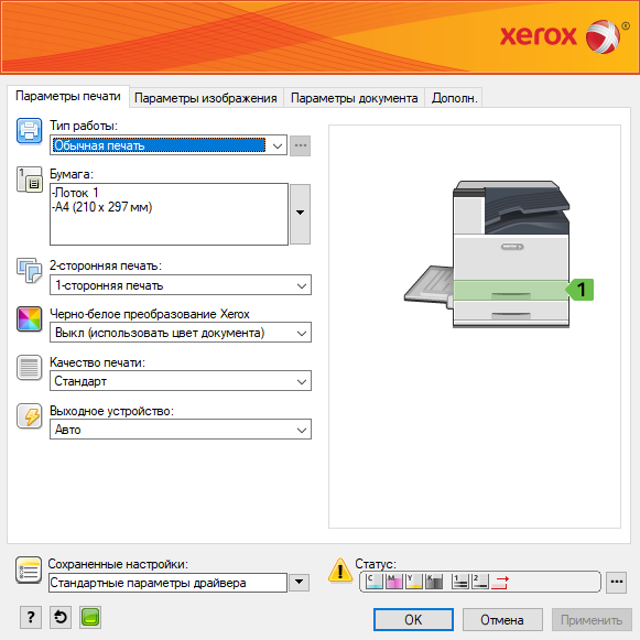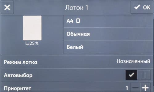 | Стандартные лотки, вместимость при 80 г/м² | подающие: выдвижные 2×520 листов, обходной 100 листов приемный: 500 листов |