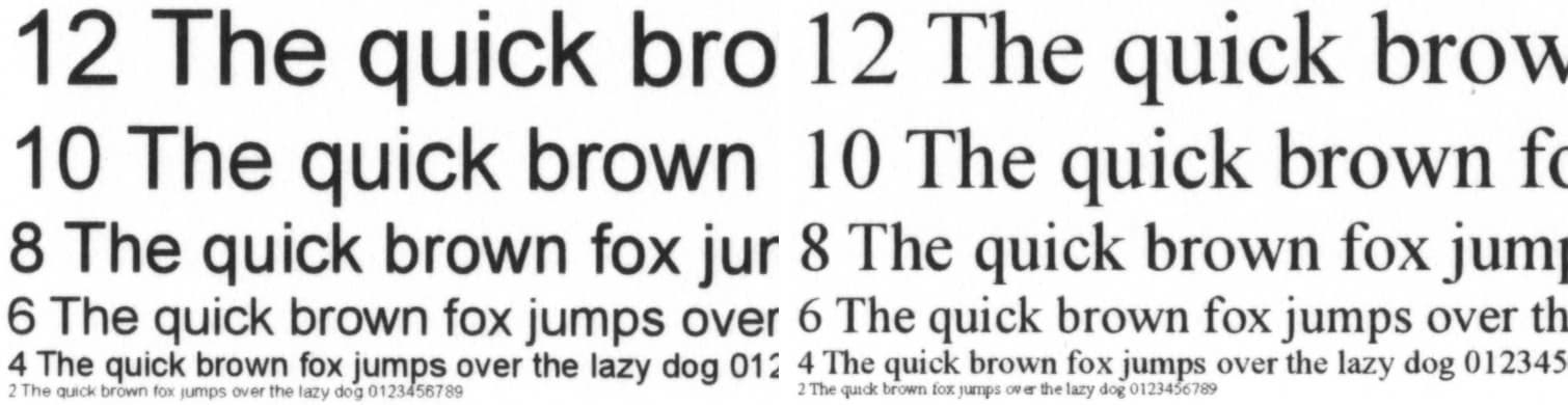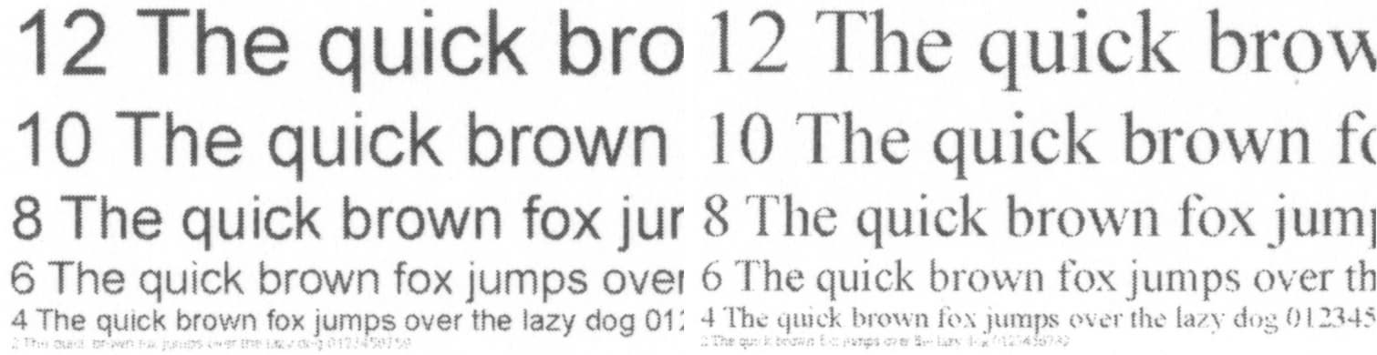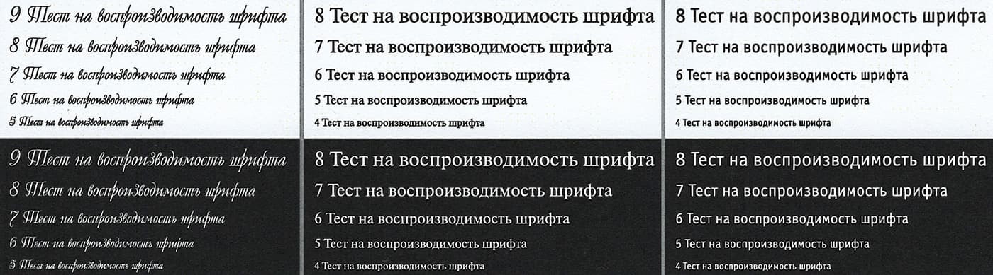 В черновом режиме отпечаток получается более бледным, становится заметным растр, что ведет к ухудшению передачи мелких деталей, а контуры букв, особенно малых кеглей, становятся неровными. Шрифты 2-го кегля не читаются, шрифт 4-го кегля с засечками читается с трудом, без засечек — более уверенно.