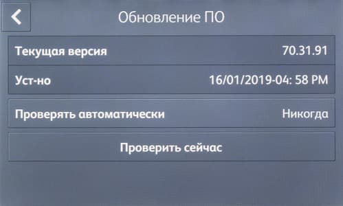 «Обновление ПО»: в нашем экземпляре была версия firmware 70.31.91. Здесь же можно включить автоматическую проверку наличия обновлений (ежедневно, еженедельно, ежемесячно) или инициировать немедленную проверку. Естественно, принтер при этом должен быть подключен к сети с выходом в интернет.