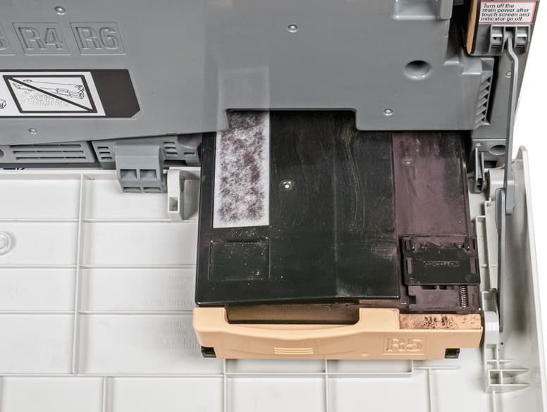 Приемный лоток довольно специфический: он делится на две части по горизонтали фигурной пластиной. Эти части в инструкции называются центральными лотками, верхним и нижним. Настройки позволяют выбирать любой из них для вывода отпечатков, а при наличии опциональных финишных устройств в нижний лоток вставляется специальный адаптер, который виден на фото: