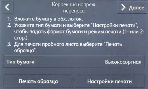 Коррекция напряжения переноса регулирует напряжения смещения на ролике переноса для печати на бумаге выбранного типа: если напечатанное изображение получается слишком светлым, следует увеличить напряжение смещения, а если на отпечатках появляются пятна или крапины, следует уменьшить это напряжение. Подчеркнем: действия выполняются для конкретной используемой бумаги.