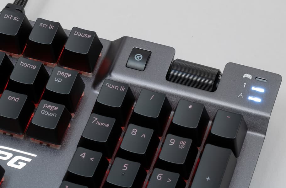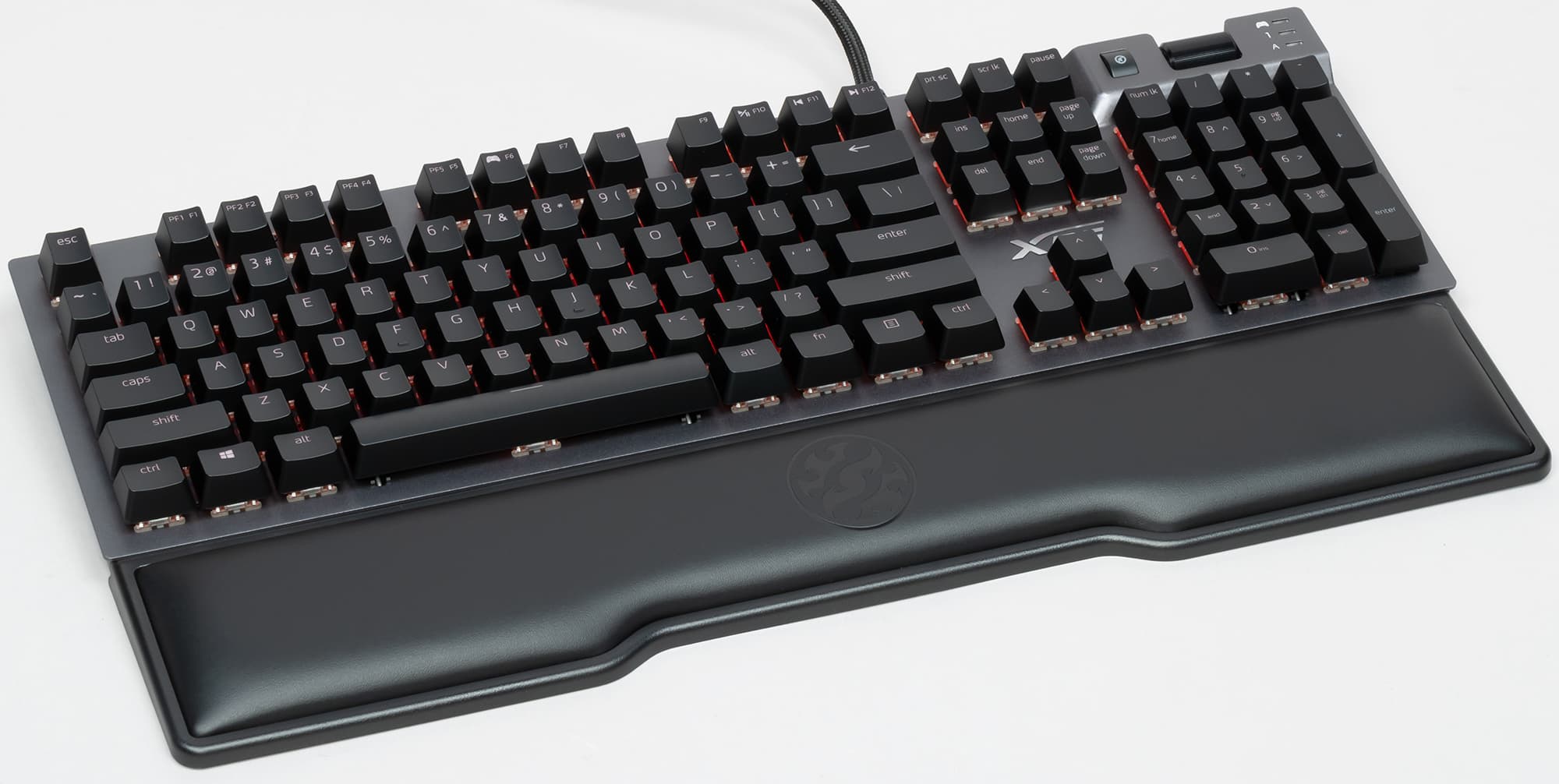 Summoner — это полноразмерная клавиатура с цифровым блоком, плюс есть еще отдельная кнопка выключающая звук и ролик громкости. Подсвечиваются все символы. Наш экземпляр тестовый, на нем нет кириллических символов, но это не говорит о том, будет ли кириллица на тех клавиатурах, которые поступят в продажу. Вдобавок в комплекте есть красные кейкапы для модников, которые хотят выделить наиболее часто используемые в играх клавиши, такие как курсорные и WASD.