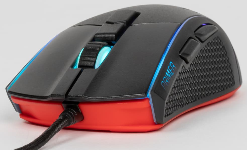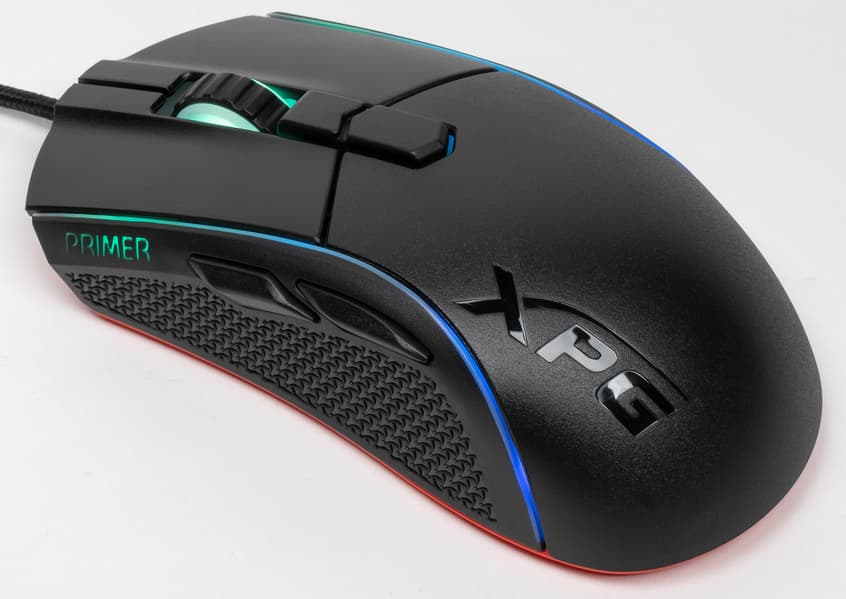 Начнем с мышки. Это XPG Primer, проводная мышь с дизайном для правшей. На это намекают две большие боковые кнопки, расположенные слева. Из-за того, что они сильно выступают из корпуса и вдобавок имеют боковую грань, на них легко нажать и сложно перепутать.
