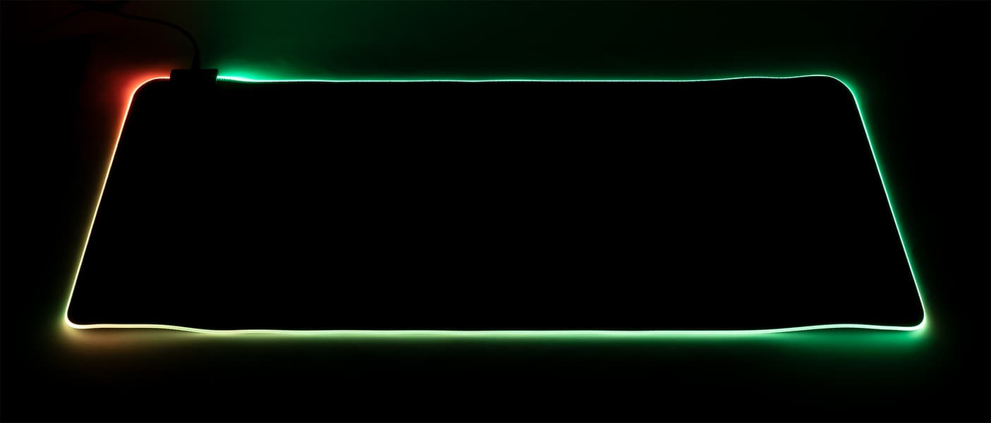 Коврик имеет каучуковую основу, чтобы не скользить, покрыт тканью под названием Cordura, то есть он влагозащищенный. Подсветка не настраивается, но с помощью кнопки на контроллере можно выбрать один из семи цветов или поставить их чередование с эффектом «дыхание».