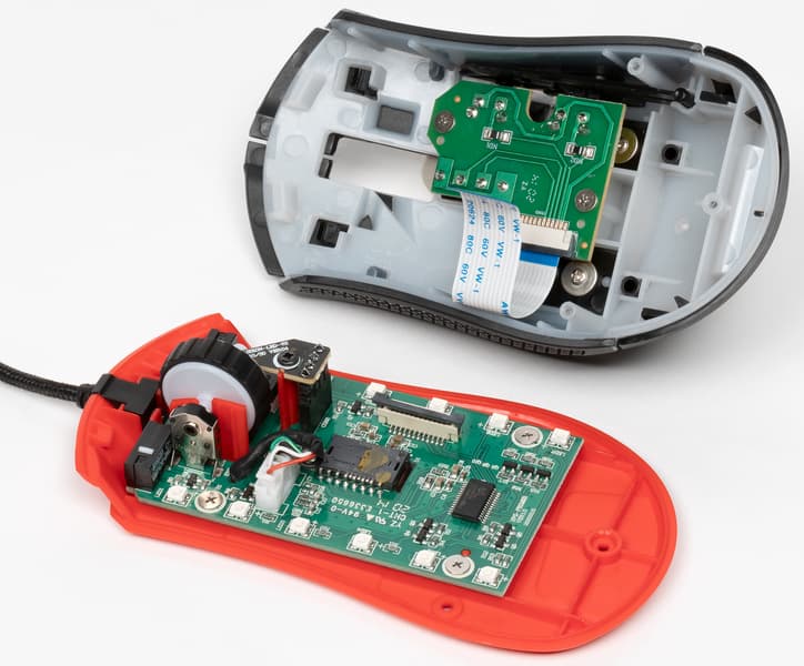 Что же по начинке. Несмотря на то, что мышка новая — о ее появлении объявили только этим летом — внутри стоит не самый топовый, но добротный сенсор PixArt PMW3360 с разрешением 12 000 CPI, скоростью отслеживания больше 250 IPS и максимальным ускорением 50 g. И это с лихвой перекрывает потребности геймера. Правда, тонко настроить чувствительность не получится, здесь предусмотрен ряд предустановленных значений: 400, 800, 1600, 3200, 6400, 12000. Между ними можно переключаться по кругу. При смене разрешения мышка несколько раз мигает разными цветами, чтобы было понятно, какой из режимов сейчас активен.