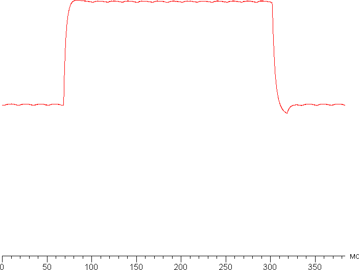 Время отклика при переходе черный-белый-черный равно 11 мс (6 мс вкл. + 5 мс выкл.), переход между полутонами серого в сумме (от оттенка к оттенку и обратно) в среднем занимает 13 мс. Матрица довольно быстрая, есть слабый разгон, не приводящий с видимым артефактам. На фронтах некоторых переходов присутствуют всплески яркости с небольшой амплитудой (график для перехода между оттенками серого 70% и 90% по численному значению цвета оттенка, яркость — вертикальная ось, время — горизонтальная ось):