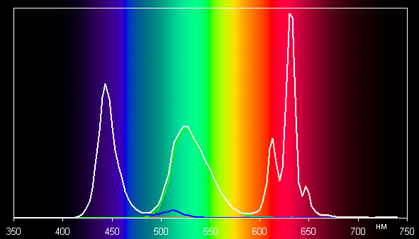 По всей видимости, в этом экране используются светодиоды с синим излучателем и зеленым и красным люминофором (обычно — синий излучатель и желтый люминофор), что в принципе позволяет получить хорошее разделение компонент. Да, и в красном люминофоре (а может и в зеленом), видимо, используются так называемые квантовые точки.