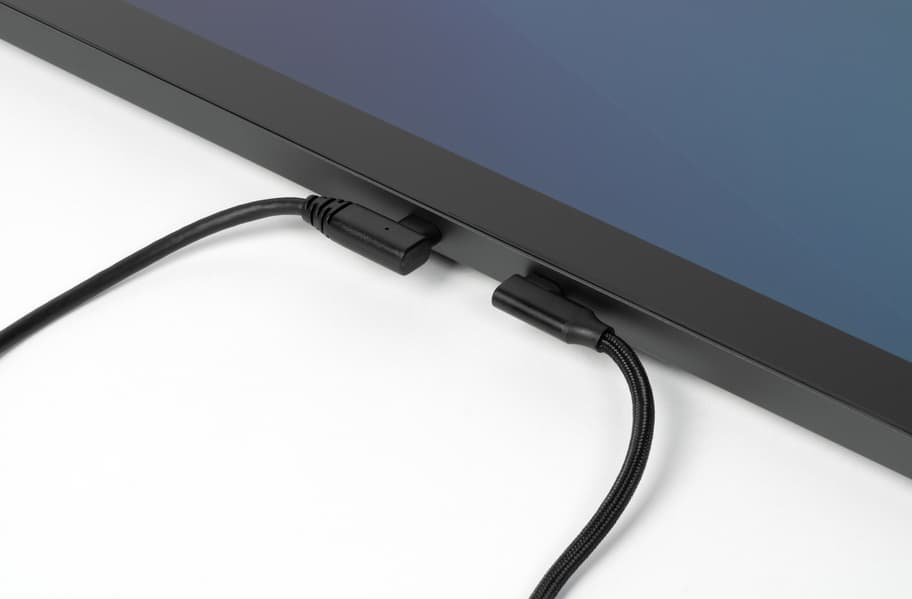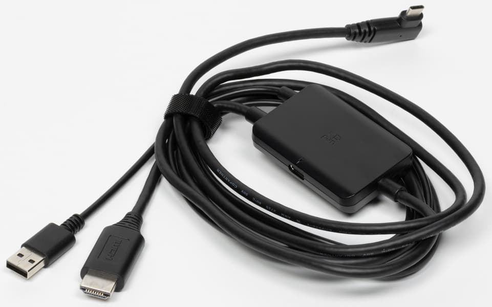 ПК или ноутбуки, оснащенные портами USB без поддержки вывода видео (DisplayPort) подключаются при помощи раздельных стыков HDMI и USB Type-A, а также нехитрого преобразователя, скрытого в небольшом пластмассовом корпусе.