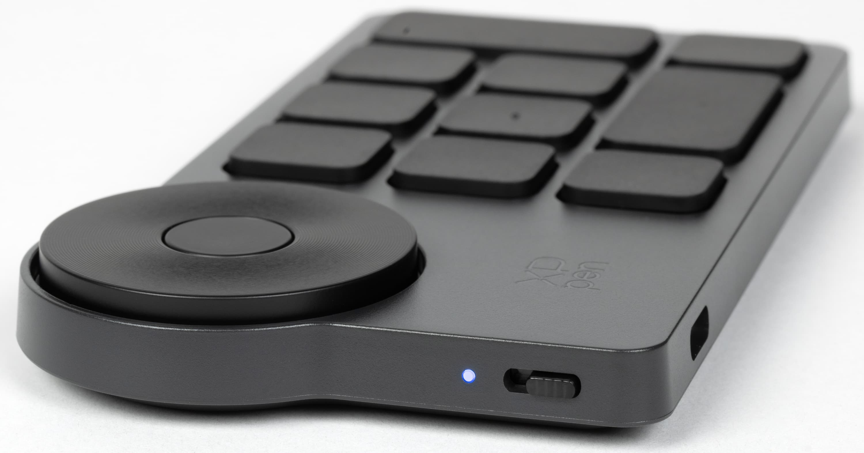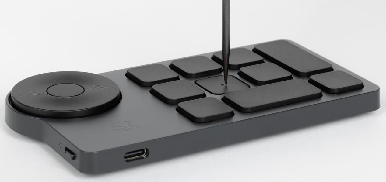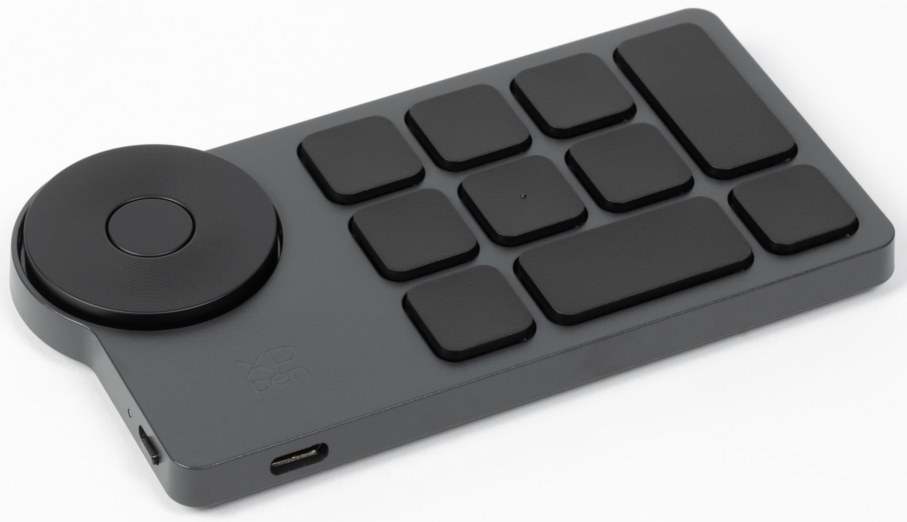 Отдельная отличительная особенность XPPen Artist Pro 19 — прилагаемый пульт управления, позволяющий назначить исполнение некоторых функций на диск с его центральной кнопкой и десять клавиш, две из которых (для упрощения работы вслепую) вдвое расширены по длине.