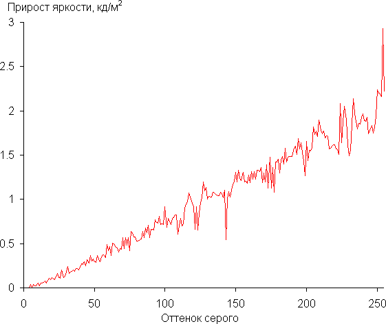 Далее мы измерили яркость 256 оттенков серого (от 0, 0, 0 до 255, 255, 255). График ниже показывает прирост (не абсолютное значение!) яркости между соседними полутонами: