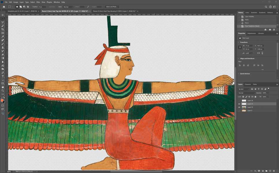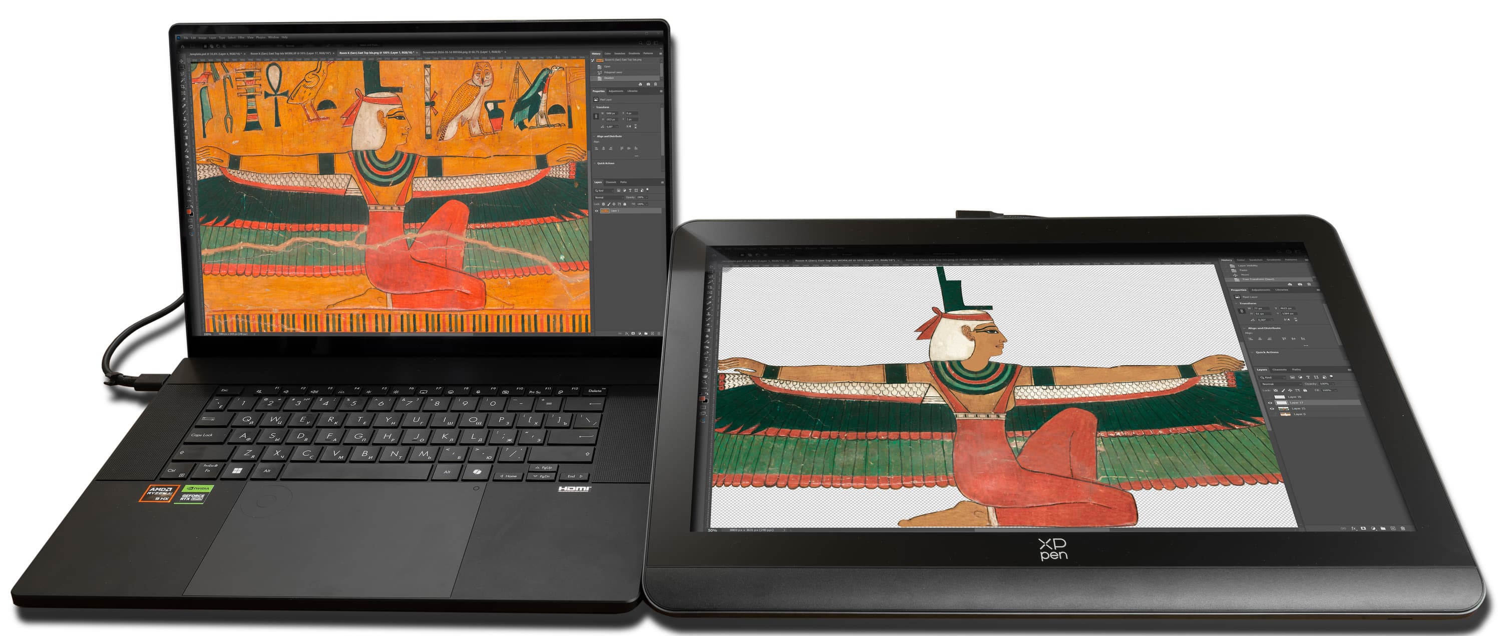 В нашем примере заметна широкая неровная линия, рассекающая рельеф Исиды в нижней его части справа налево. Эта трещина была заделана реставраторами, но вернуть на место сместившиеся массы известняка было невозможно. Есть и другие дефекты красочного слоя, но с большинством из них можно мириться, а вот трещину безусловно следует удалить. Сделать это можно в Adobe Photoshop с использованием инструмента Content Aware Fill (заливка с учетом содержимого). Для этого полагается выделить рисунок трещины вручную (автоматически это практически невозможно), сделав отступ (припуск) в сторону сохранившегося изображения (в идеале припуск должен составлять не более двух-трех пикселей). Эта операция при использовании мыши потребовала около получаса, а XPPen Artist Pro 19 помог сократить время выделения трещины до трех минут, то есть во втором случае этот этап был завершен в десять раз быстрее.