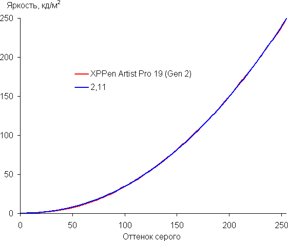Аппроксимация полученной гамма-кривой дала показатель 2,11, что немного ниже стандартного значения 2,2, поэтому картинка чуть высветлена. При этом реальная гамма-кривая мало отклоняется от аппроксимирующей степенной функции: