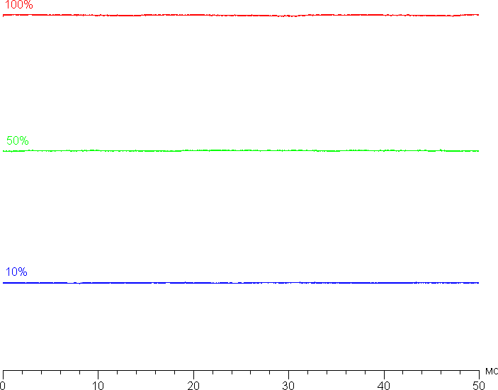 На любом уровне яркости значимая модуляция подсветки отсутствует, поэтому нет и никакого мерцания экрана (нет ШИМ). В доказательство приведем графики зависимости яркости (вертикальная ось) от времени (горизонтальная ось) при различных значениях настройки яркости: