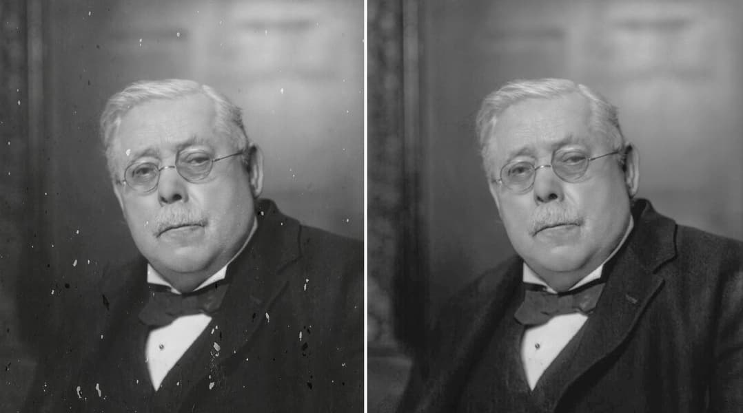 Принцип ретуши в таком случае довольно прост, но весьма трудоемок: крупные дефекты обводятся мышью или стилусом, мелкие подавляются при наведении курсора с помощью восстанавливающих кисти или ластика, заливки с учетом содержимого или генеративной заливки с ИИ. Основное время расходуется на изменение масштаба изображения (увеличить — уменьшить), его перемещение внутри окна, позиционирование курсора и выделение дефекта, поэтому использование мыши означает долгий, многочасовой процесс. Не станем вдаваться в описания, а просто покажем исходную картинку рядом с полученным результатом.