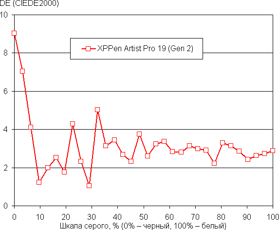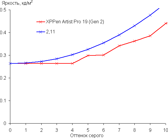 Рост прироста яркости на шкале серого в основном равномерный, и почти каждый следующий оттенок ярче предыдущего. Однако в самой темной области есть небольшой завал — первые четыре оттенка серого по яркости от черного не отличаются: